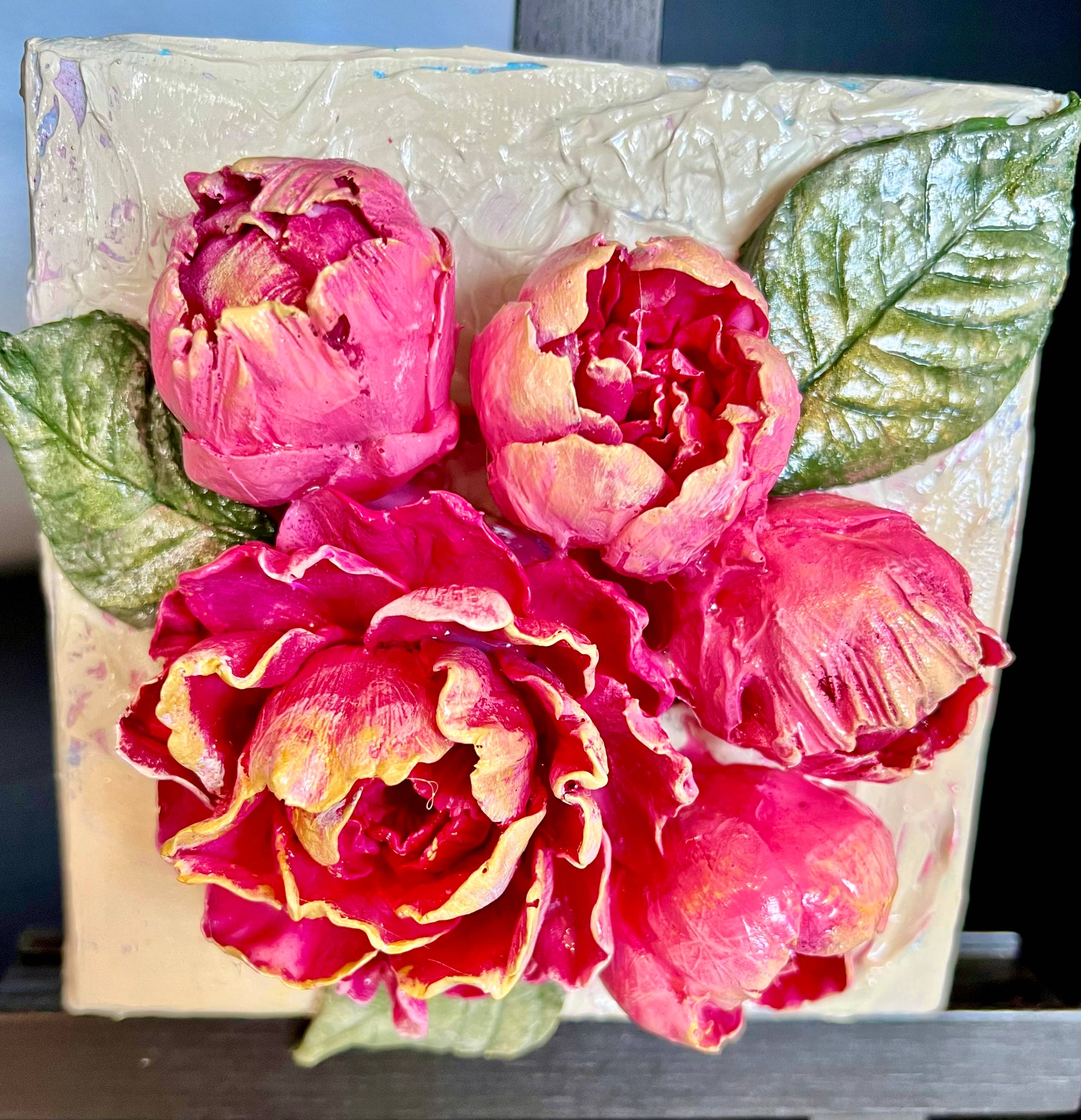 Tulipes texturées et peintes à la main sur toile. Peinture acrylique avec des reflets dorés métalliques, idéale pour toute décoration intérieure. Chaque pièce est une œuvre originale, donc bien que similaires, deux pièces ne seront jamais exactement identiques. Taille de la toile : 15,2 cm x 15,2 cm x 3,8 cm