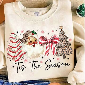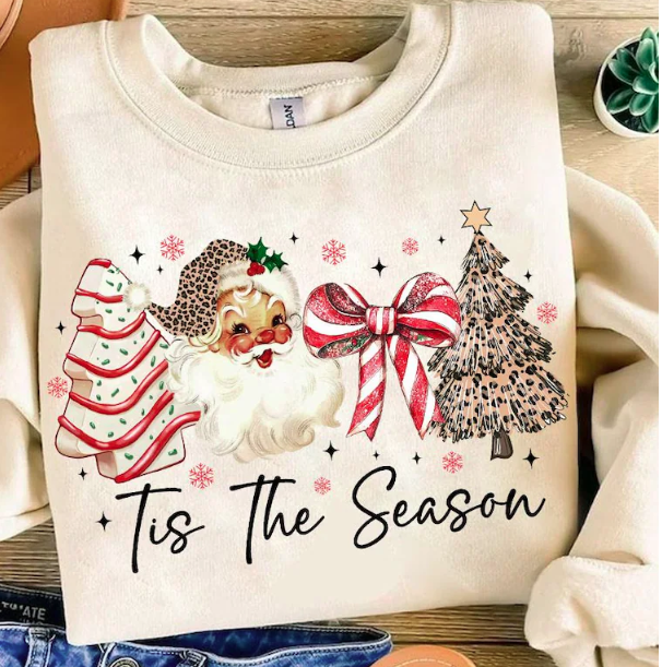 Imprimé DTF vibrant et durable sur le thème de Noël sur un sweat-shirt à col rond confortable.
