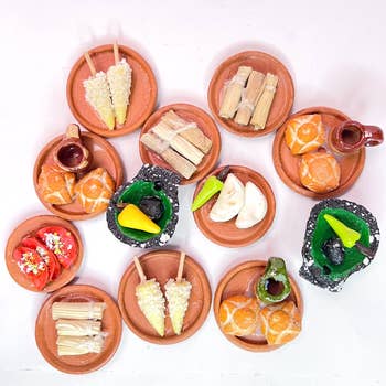 Une douzaine. Mini assiettes avec des aliments traditionnels par unité. Différents objets variés. Figurines en argile pour toutes les occasions ou pour le Jour des morts fabriquées au Mexique.