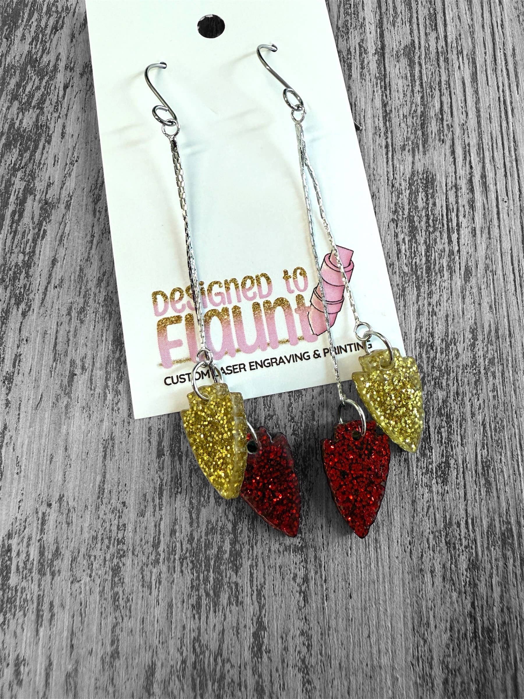 Ces pointes de flèche creuses rouges et dorées pailletées de Designed To Flaunt sont un ajout incontournable à votre collection de bijoux. En tant que boucles d'oreilles pendantes, elles ajoutent une touche de couleur et d'éclat à n'importe quelle tenue. Fabriquées avec précision, ces boucles d'oreilles sont imprimées en UV et gravées au laser dans notre atelier à Olathe, KS, garantissant des accessoires de haute qualité pour nos clients. Profitez du parfait mélange de style et de qualité avec ces boucles d'oreilles éblouissantes.