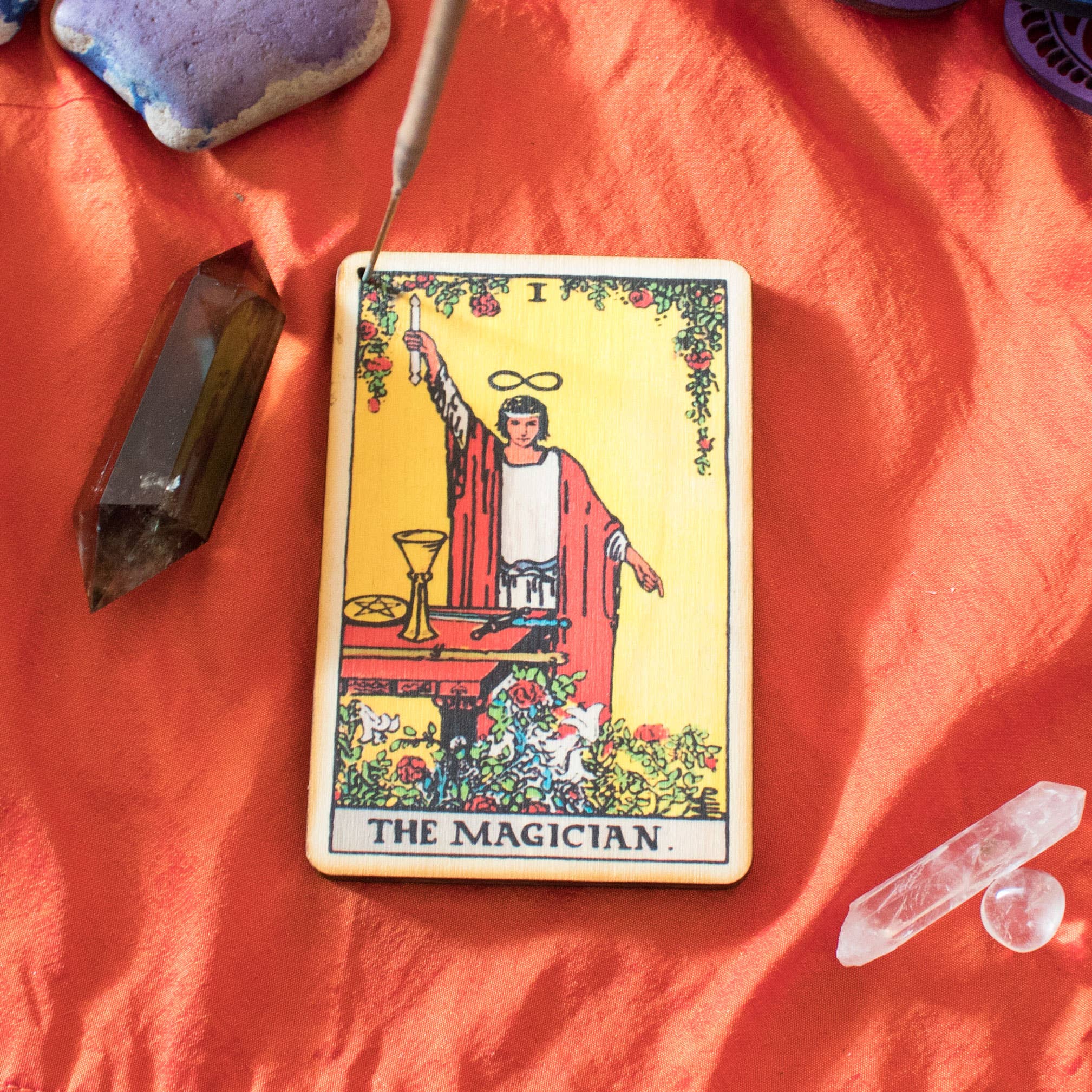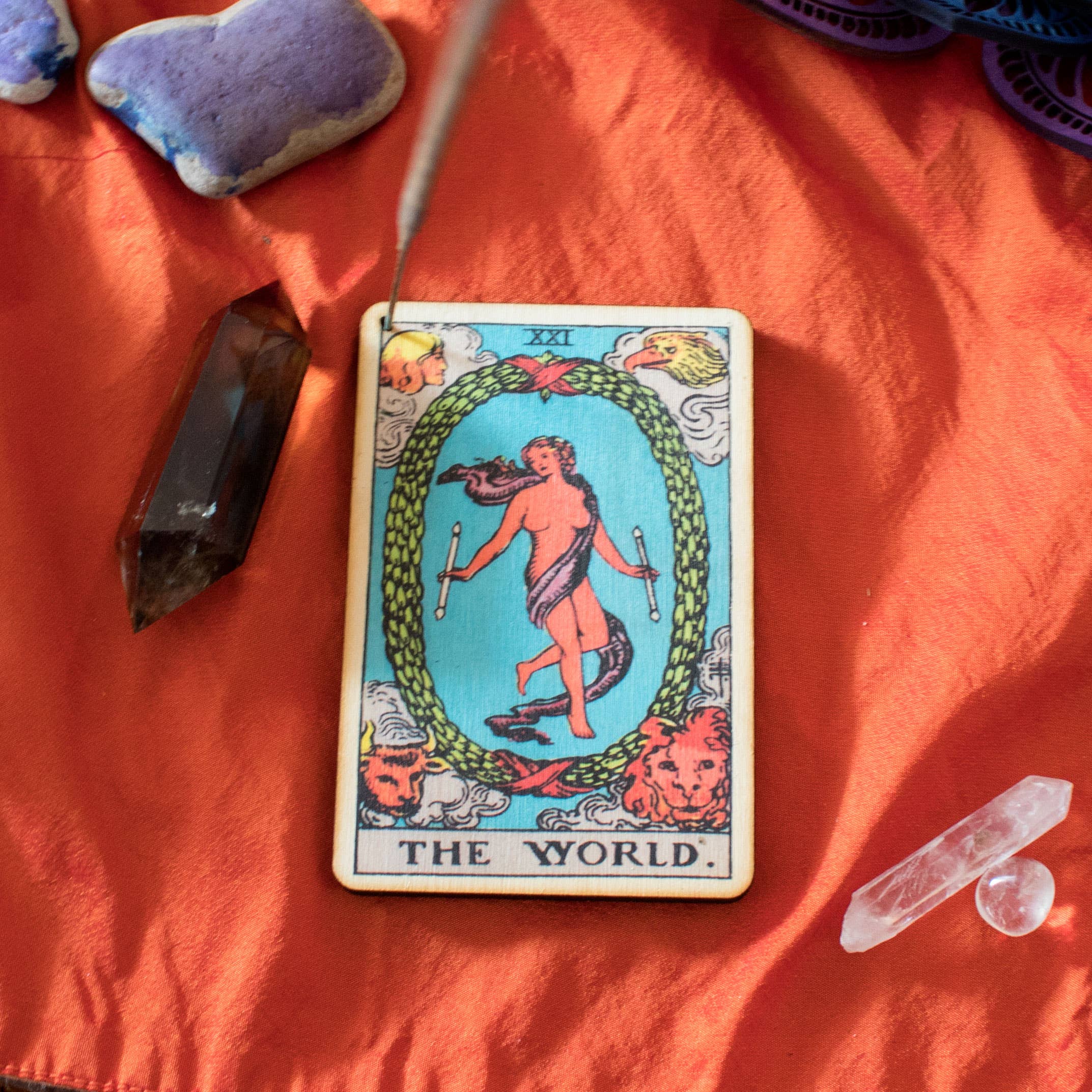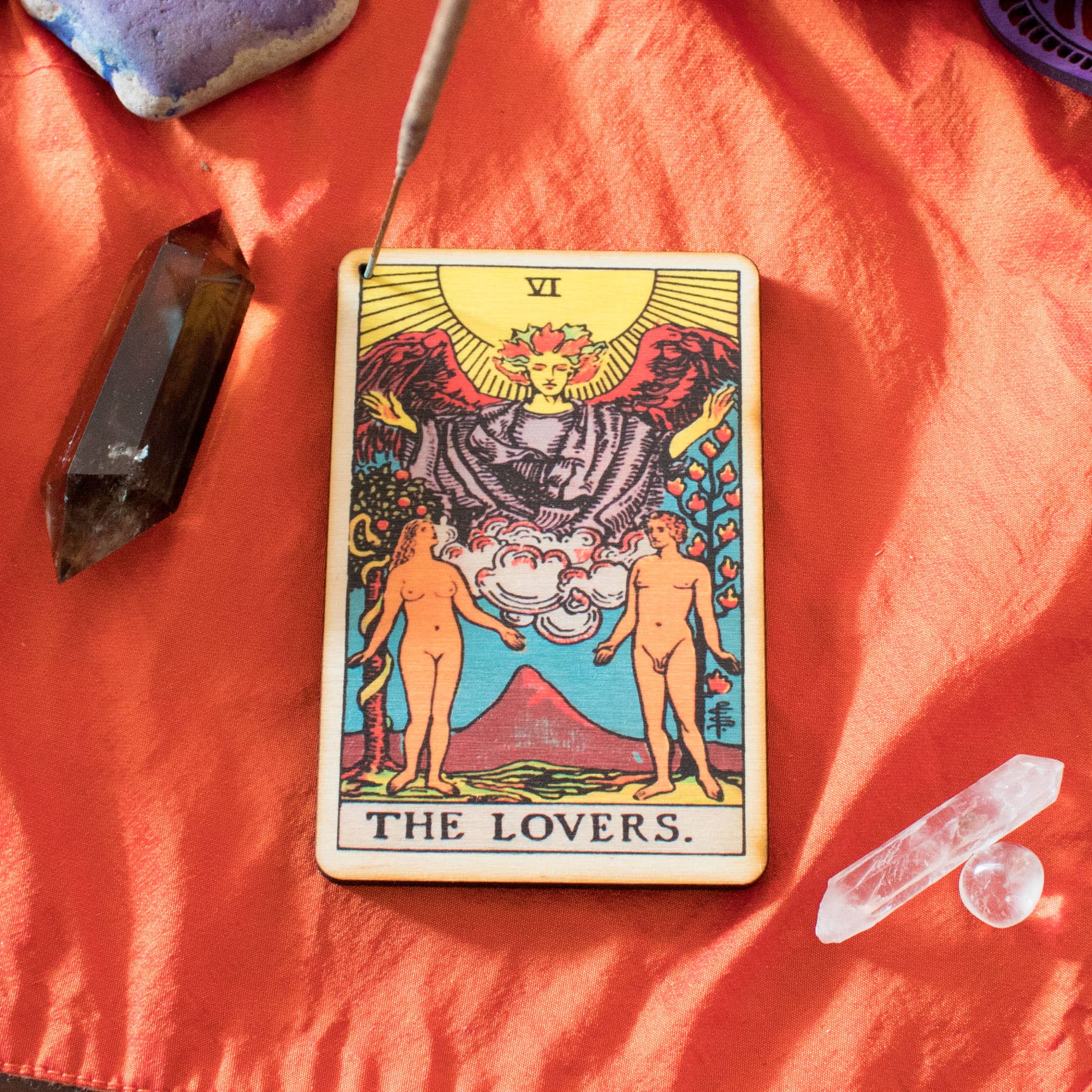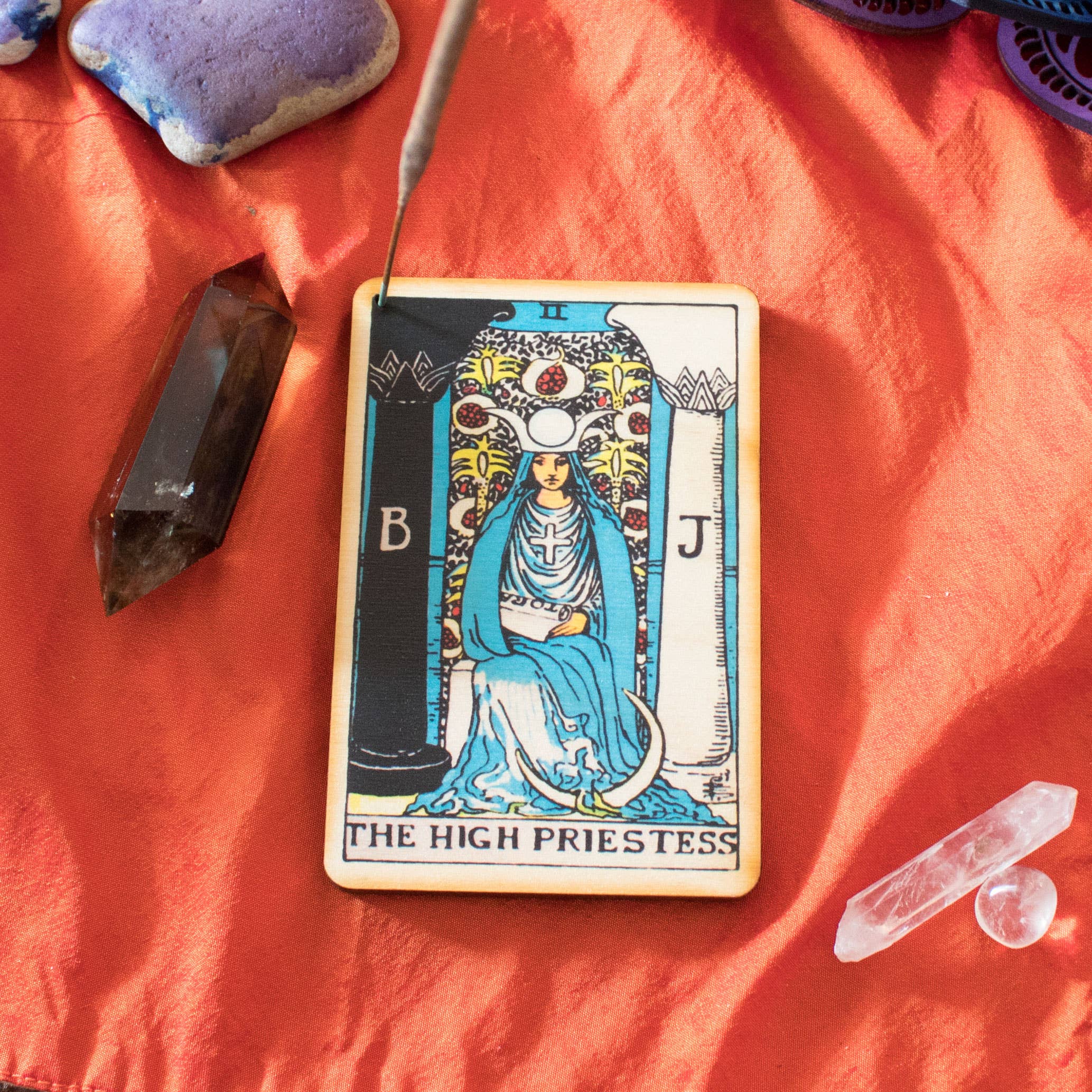 3"x4.5". Doté d'une empreinte de carte de tarot en couleur. Pour une utilisation avec des bâtons d'encens avec tige en bois seulement. Ne pas utiliser avec de l'encens cône. Fabriqué à la main à San Diego, Californie.