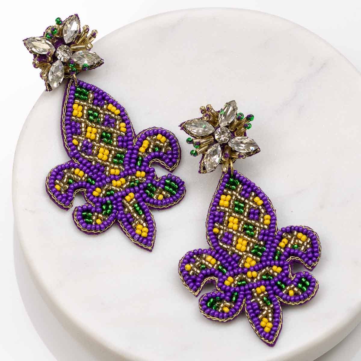 Élégante et intemporelle, cette boucle d'oreille pendante scintillante en forme de fleur de lis aux couleurs vives allie simplicité et glamour. Fabriqué avec précision, le design complexe scintille sous toutes les conditions d'éclairage. Serti dans des fermoirs de boucles d'oreilles en argent sterling 925. Parfait pour toute fête de Mardi Gras.