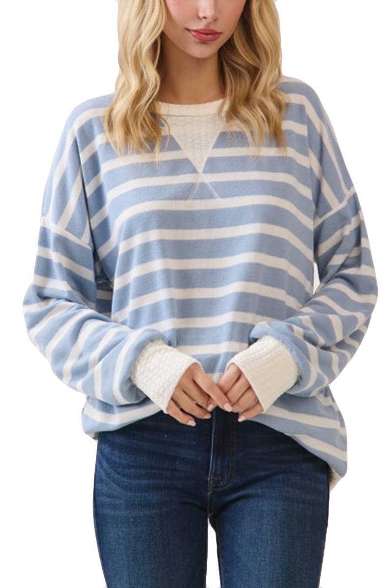 Un haut en tricot rayé à manches courtes avec un col rond, un corps coloré et une coupe ample. Le tissu est un tricot de coton léger Le mannequin mesure 1,80 m et porte une taille S. Contenu du tissu : polyester Taille du corps : moderne et plus. Motif : rayé Longueur : manches courtes Style : col rond