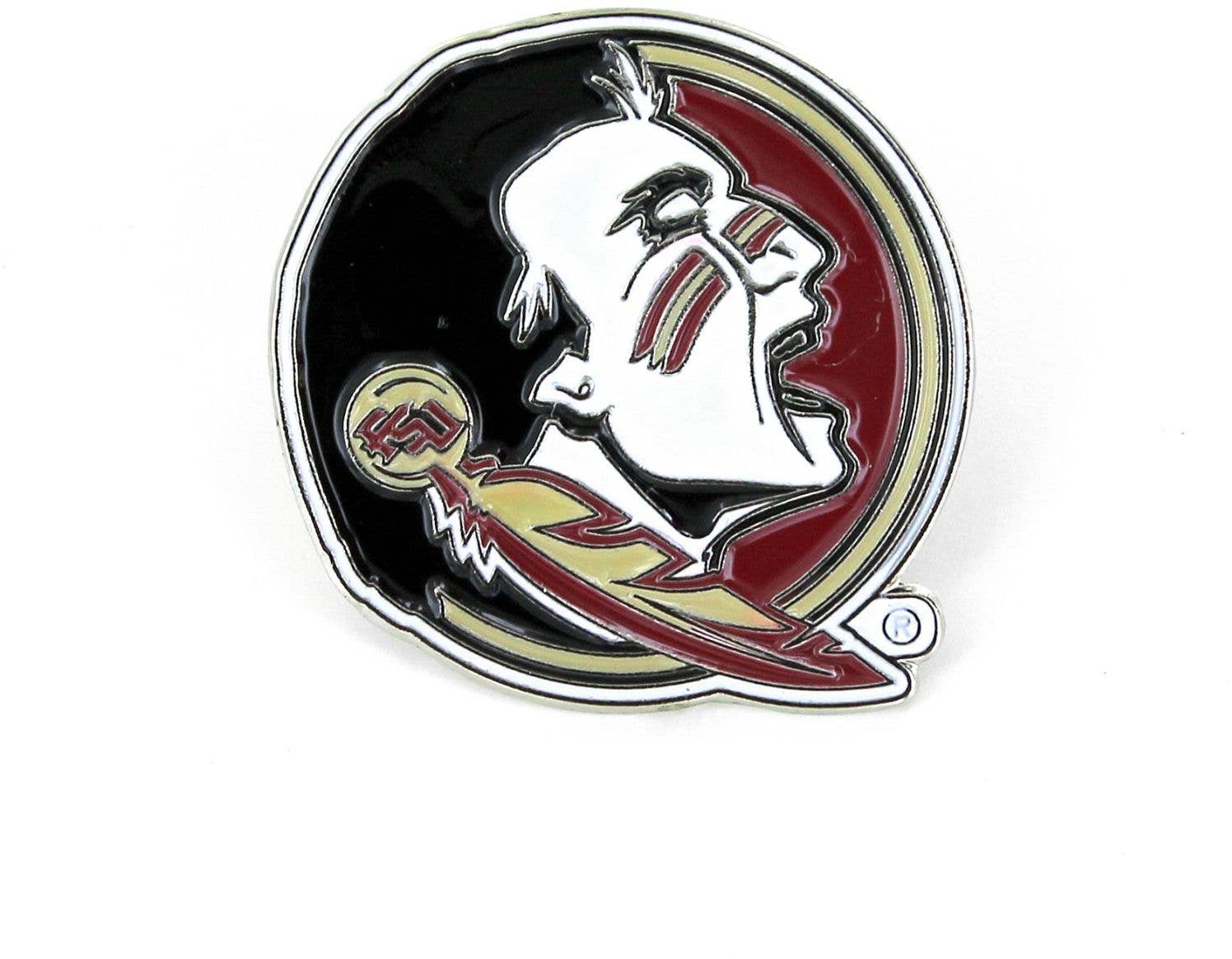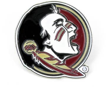 Épinglette en métal argenté ornée de grenat et d'émail doré et du slogan « Go Noles ». L'épingle mesure environ 2,5 pouces de largeur. Il s'agit d'un produit sous licence officielle.