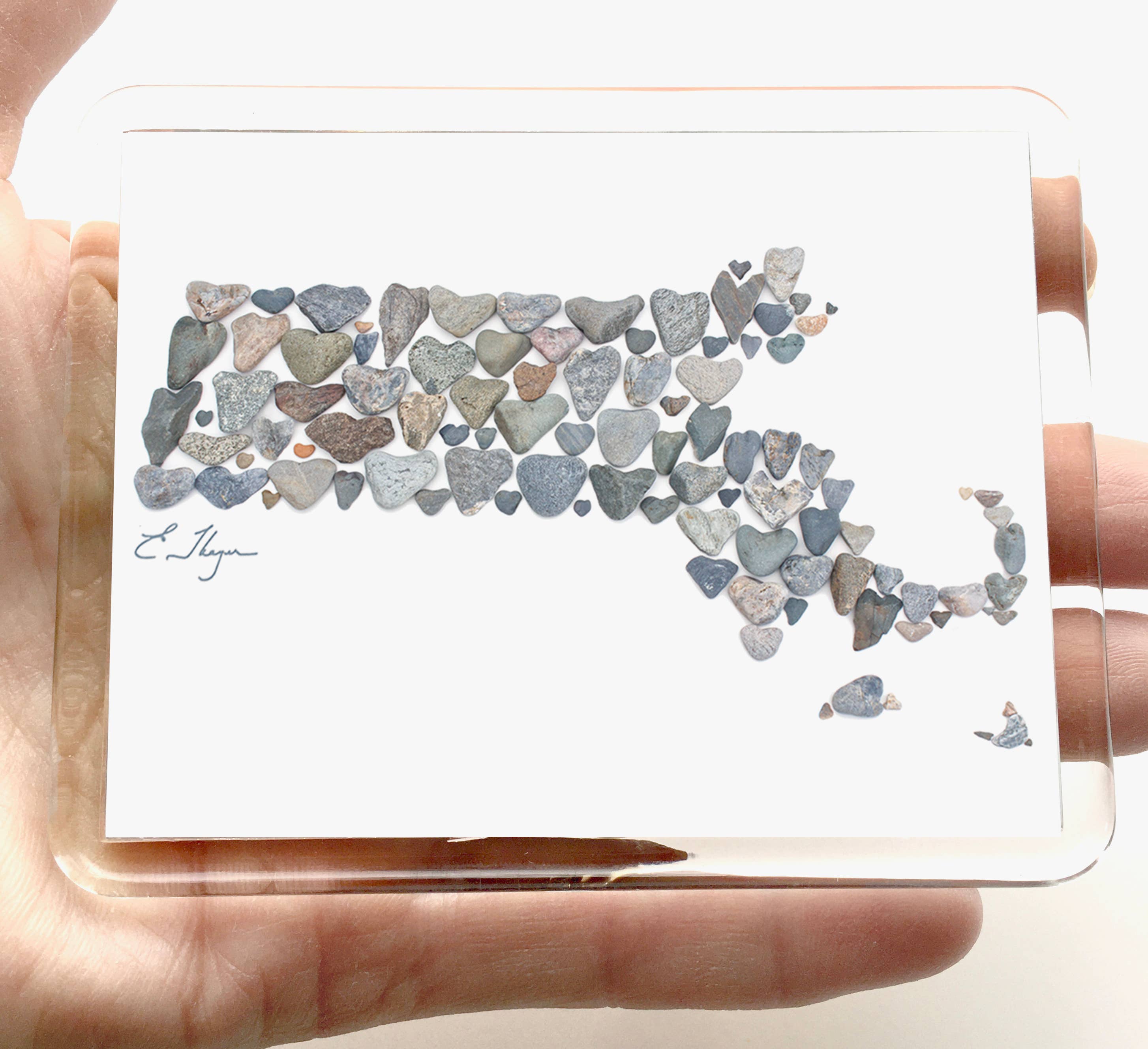 Ces dessous de plat Nantucket Basket ont été imprimés avec mon design photographié de 171 pierres en forme de cœur naturellement formées, issues de ma collection de trois décennies d'exploration des plages et îles du Maine. D'autres pierres en forme de cœur ont été utilisées pour créer la bordure. L'œuvre d'art originale en vue de dessus mesurait environ 3 pieds de long lorsque je l'ai photographiée depuis une échelle à l'extérieur. • L'art est imprimé sur grès par CoasterStone (USA) pour l'absorption de l'humidité et de la chaleur • Mesurant 7,8" carrés, ils ont une profondeur de 1/2" et un dos en liège avec une étiquette qui indique : Photographie originale en vue de dessus conçue avec des pierres en forme de cœur façonnées par les vagues le long de la côte du Maine • Chacun est emballé individuellement dans une boîte CoasterStone avec un autocollant SKU Merci de votre visite !