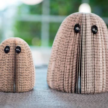 Ces fantômes écologiques sont fabriqués à partir de livres usagés et constituent une façon unique de décorer pour l'automne et Halloween. Décor effrayant que vos clients peuvent utiliser pour décorer leur table, leur cheminée ou tout autre endroit où ils souhaitent ajouter une touche effrayante. Nous les adorons comme cadeaux pour la fête d'Halloween. Ils constituent également de superbes cadeaux pour les amateurs de livres ! Dimensions approximatives : Bébé fantôme : 3-1/4 po H x 3-1/4 po L Mama Ghost : 5 po de haut x 4 po de large