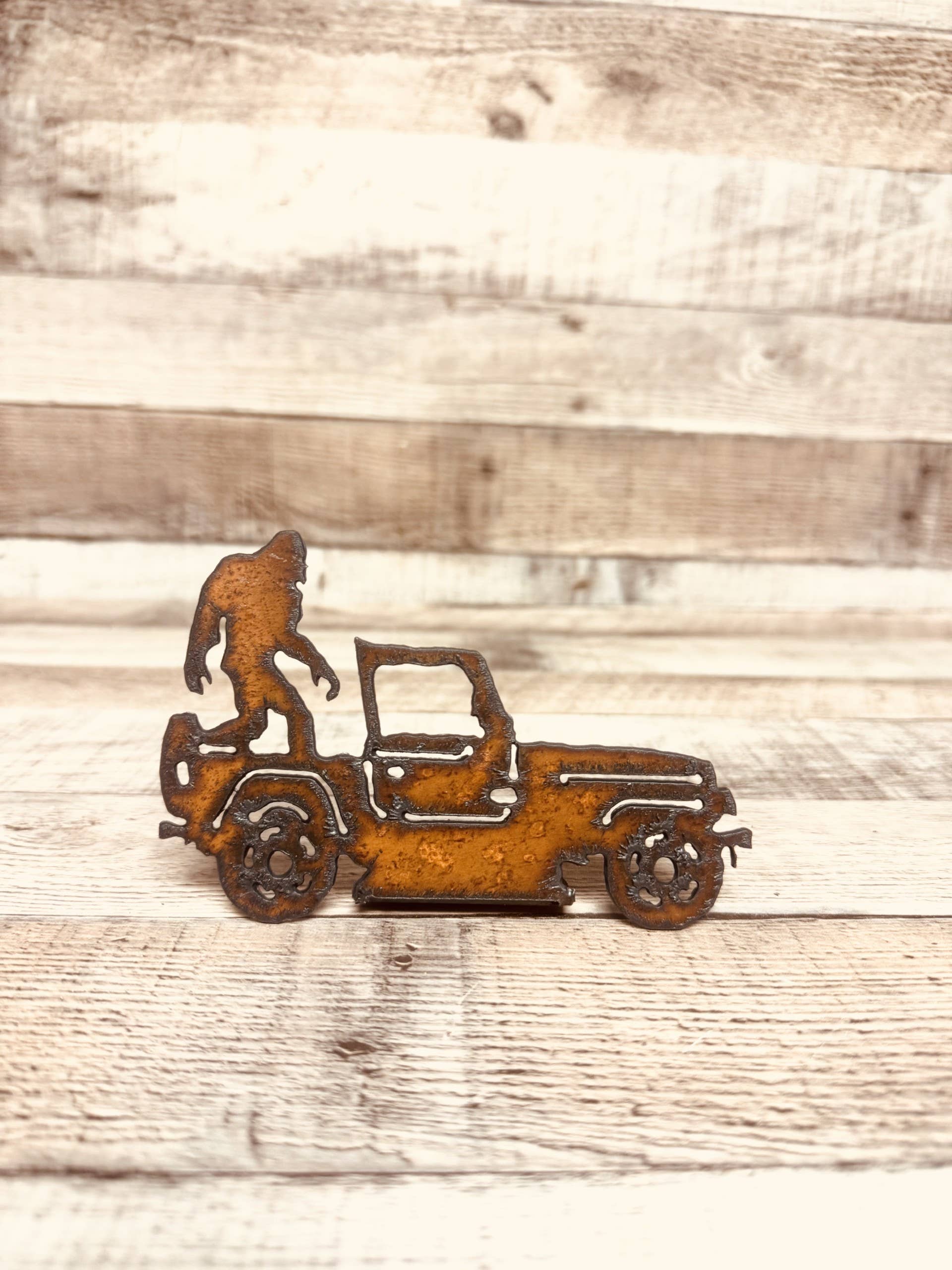 Ce design en bois stratifié présente une forme de jeep sur une grande base avec une jeep conduisant hors route dans un paysage de montagne et de forêt.