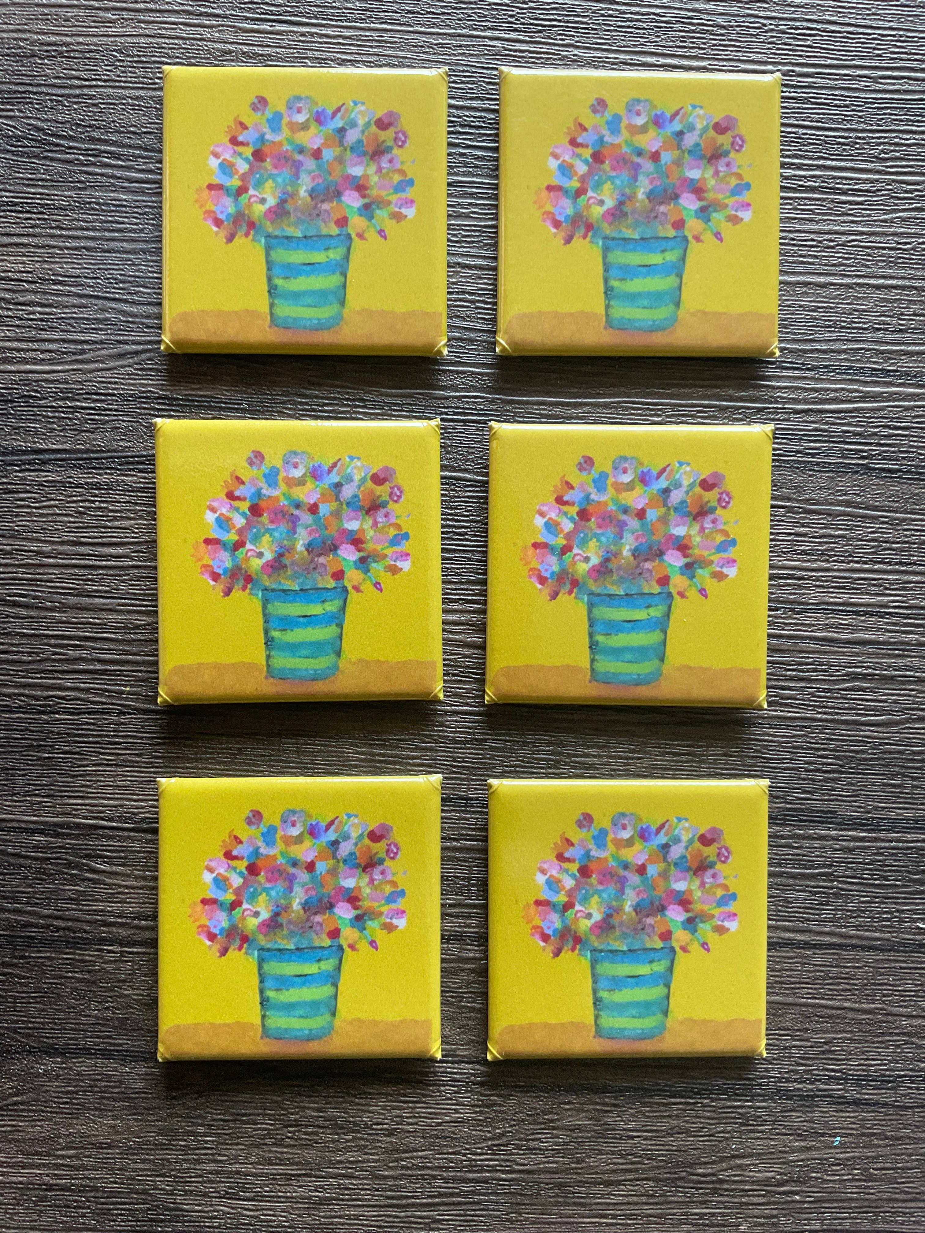 Nos aimants en verre biseauté présentent de magnifiques compositions florales naturelles pressées, enfermées sous un verre biseauté et entourées d'une bordure en cuivre. Toutes nos créations florales sont réalisées dans notre boutique de petite ville en Utah. Ces superbes pièces florales peuvent également être personnalisées en aimants avec un logo, un mot, une ville, etc., imprimés sur le verre. Nous vous enverrons une épreuve de votre pièce personnalisée avant la production. Ces aimants biseautés sont d'excellents accessoires floraux et cadeaux à thème floral. Ils se vendent très bien dans les boutiques de fleurs, jardins botaniques, zoos, musées et magasins de cadeaux indépendants. Nous proposons un ensemble d'exposition d'aimants comprenant 50 aimants biseautés assortis, un présentoir rotatif de qualité en bois, ainsi que 8 aimants offerts pour compenser le coût du présentoir. Détails importants : - Les motifs floraux varient selon les saisons et les compositions. - Dimensions des aimants : 5 cm x 5 cm - Commande minimum : 25 pièces, 50 pièces pour personnalisation.