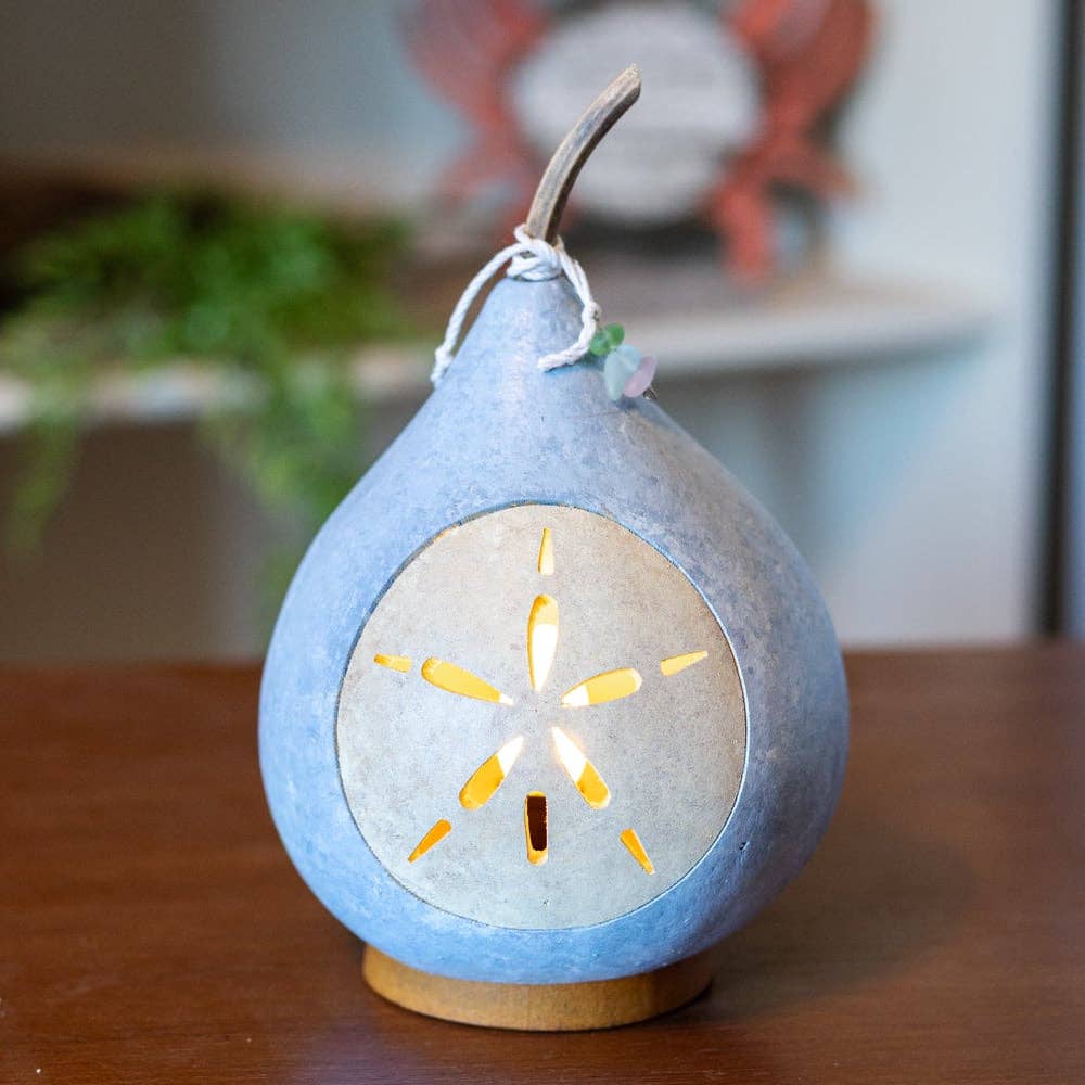 Cette luminaire en gourde avec drapeau américain patriotique est teinte à la main en rouge et avec un accent bleu peint à la main. Le drapeau et les étoiles sont découpés par nos artisans experts. Cette pièce est livrée avec une lumière électrique qui diffuse une lumière chaude à travers les découpes du drapeau et des étoiles. Environ 15 cm de diamètre et 20 cm de hauteur. Étant donné que ce design est fabriqué à partir d'une gourde naturelle, chaque pièce est légèrement différente, ce qui en fait une pièce artisanale unique avec des variations naturelles de couleur et de taille. Avertissement : Les gourdes sont inflammables. Ne pas utiliser de bougies à l'intérieur ou les placer près de flammes nues.