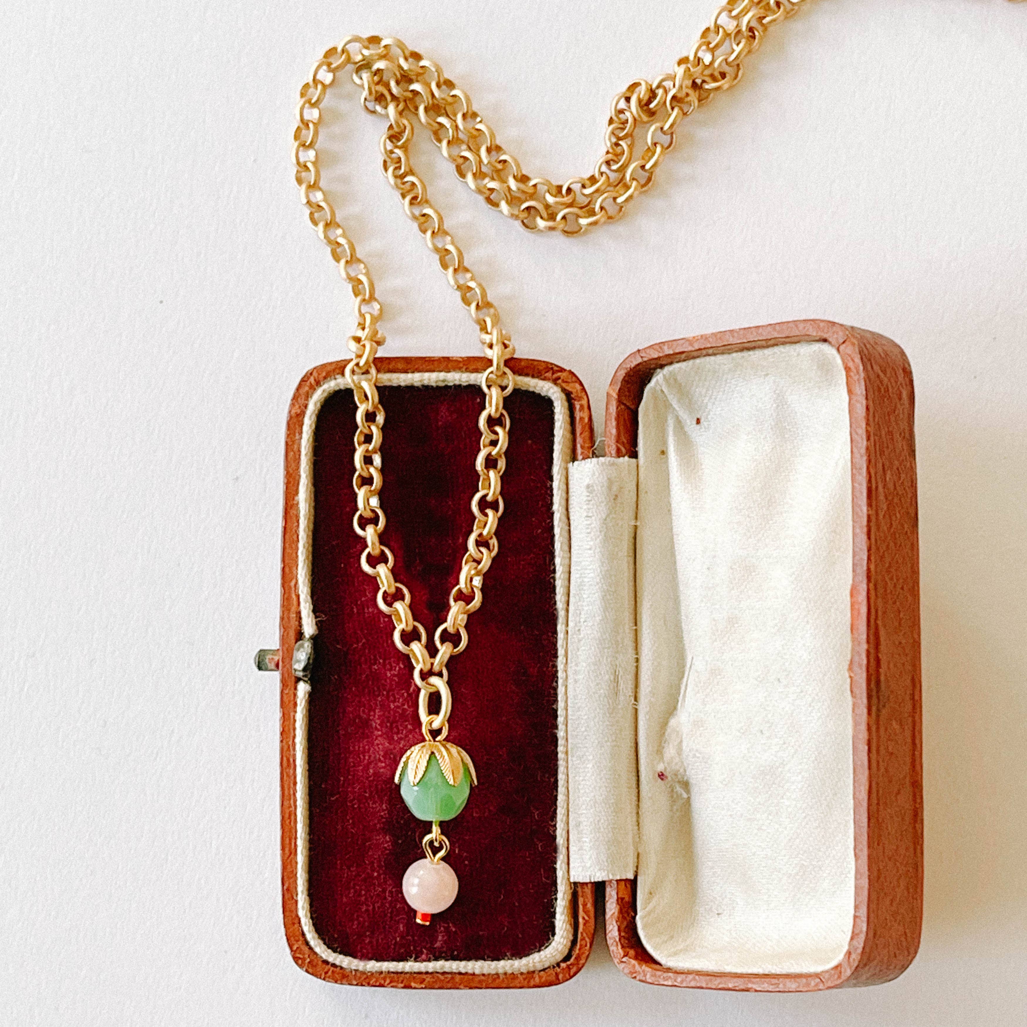 Un magnifique collier ajustable de 16"-18" fabriqué avec une chaîne en trombone faite à la main et une perle blanche en cristal Preciosa de 8 mm suspendue au centre. Les détails : Grande chaîne en trombone Chaîne plaquée or mat 24K Perle en cristal Preciosa de 8 mm 16" avec extension de 2" Fermoir mousqueton Fait main dans notre studio de Burlington VT