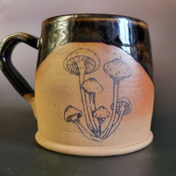 Mug en céramique fabriqué à la main ou jeté à la roue avec un motif floral imprimé noir varié dans une glaçure noire avec une superposition de teinte bleu grisâtre Dimensions : 4,5 pouces de hauteur x 3 pouces de diamètre, peut contenir environ 16 oz. Passe au lave-vaisselle et au micro-ondes.