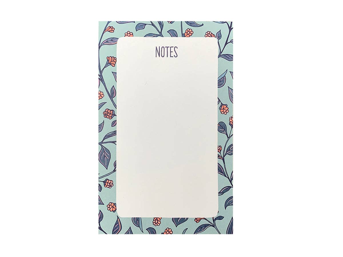 Taille 3 1/2 « x 5 1/2 » Impression numérique sur du papier textuel non couché Description de l'image : un petit bloc-notes blanc, bordé d'une couleur vert clair remplie de pins vert foncé, avec le texte vert « NOTES » sur le dessus Toutes les images, produits et designs © Noteworthy Paper & Press