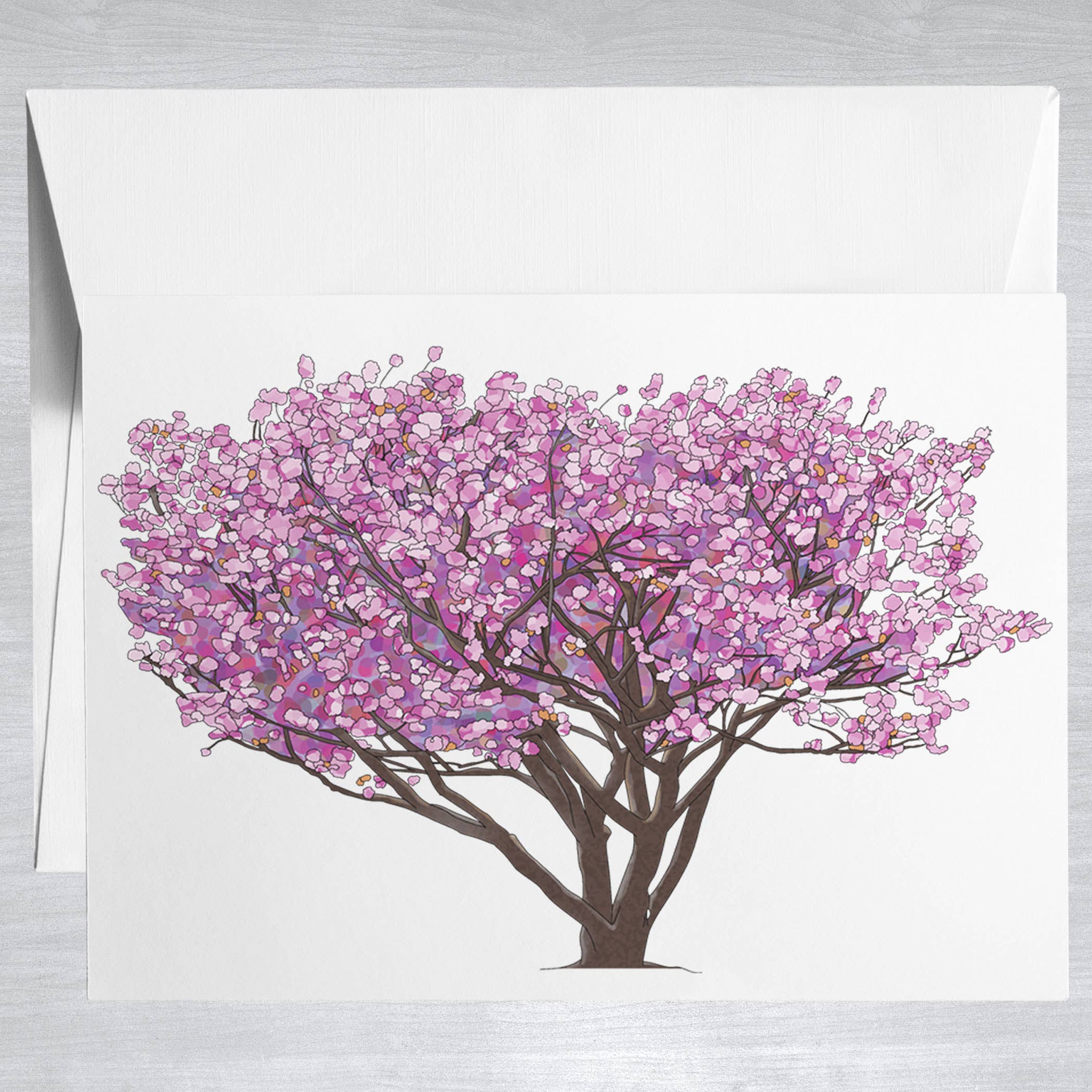 Carte pliée de 4,33" x 5,59" sur papier cartonné en lin. Elle présente ma peinture "DC in Blossom", créée pour célébrer Washington, DC, son magnifique épanouissement printanier, et beaucoup d'espoir obstiné et justifié.