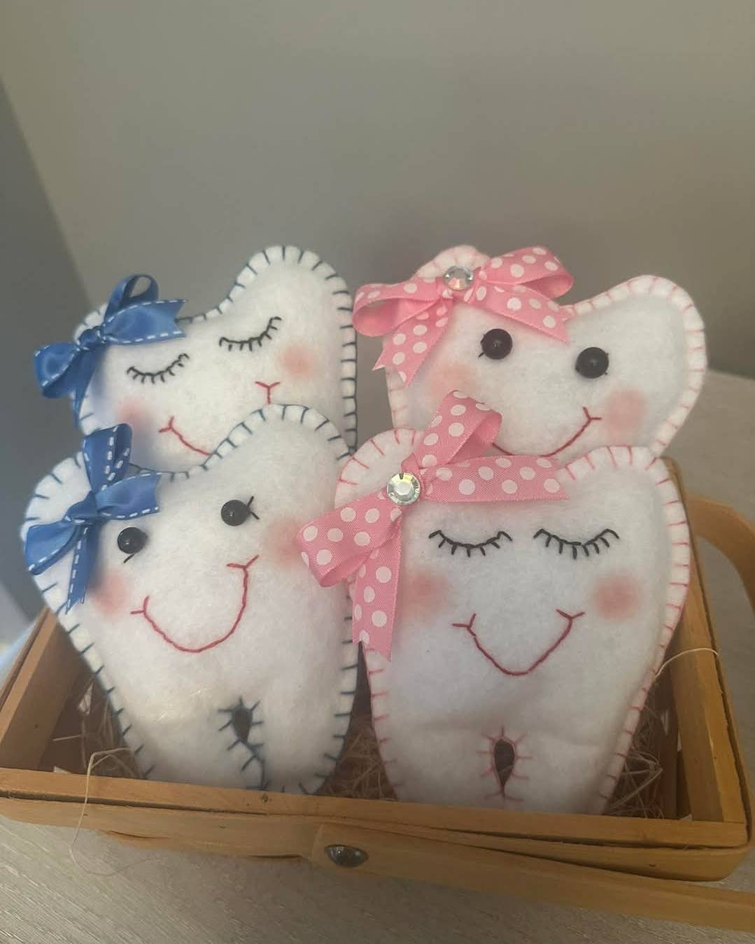Une façon adorable pour l'enfant de stocker sa dent pour la fée des dents ! Cet oreiller suspendu fera en sorte que les cadeaux de la fée des dents trouveront le chemin vers leur destinataire avec ce charmant oreiller en forme de dent. L'oreiller aux yeux larges, heureux smiley face est fait d'un satin blanc avec impression bleue comme les joues. Il est sûr de plaire à tout enfant et de leur donner de l'excitation pour le lendemain matin. L'oreiller dispose d'une poche en haut qui est assez petite pour tenir facilement la dent à l'intérieur et est juste la bonne taille pour l'argent et les pièces de monnaie. L'oreiller mesure 6,75 pouces de largeur et mesure 7,5 pouces de hauteur.