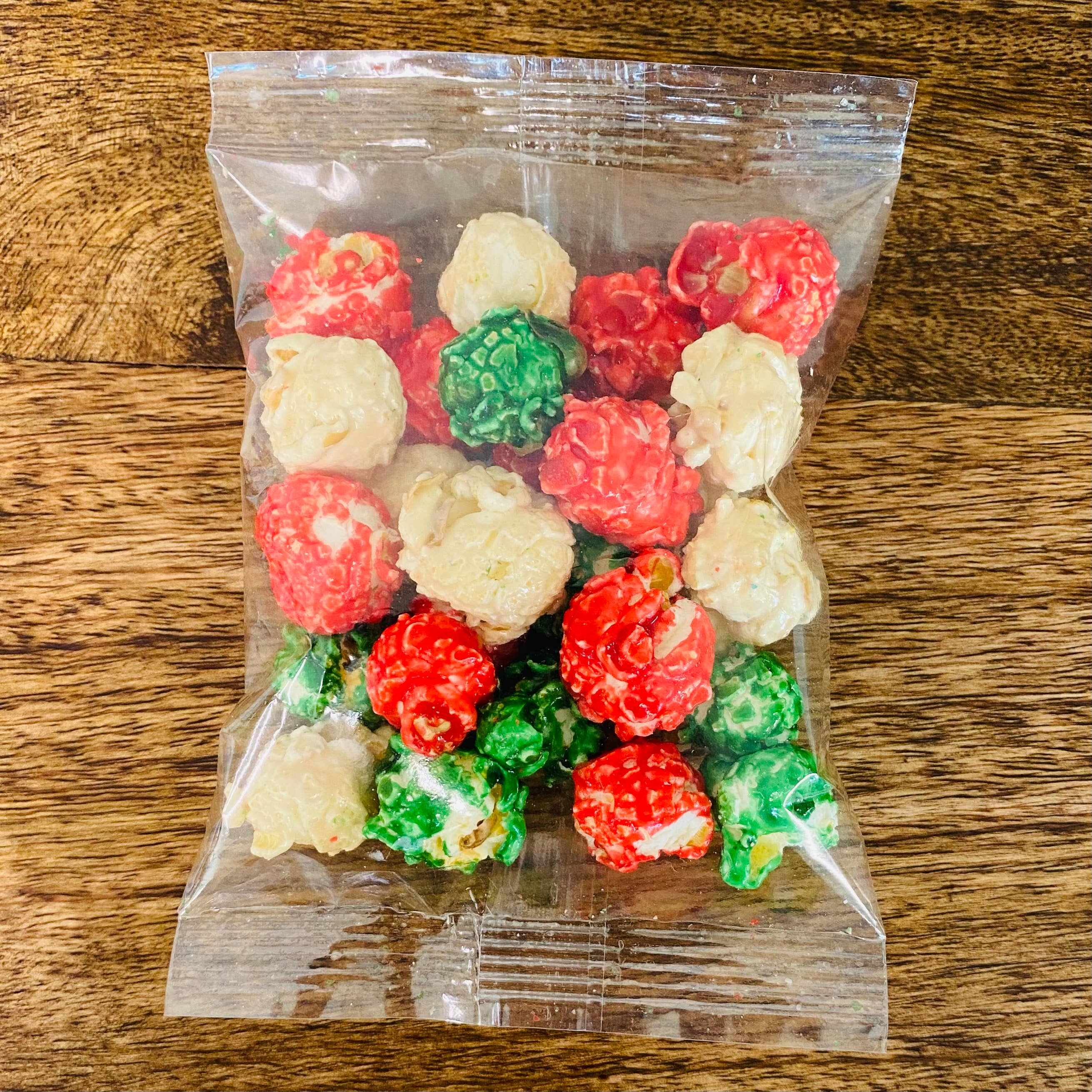 Popcorn à la vanille des fêtes en rouge, vert et blanc dans un sachet transparent de 1/2 tasse. Idéal pour les cadeaux aux clients, les fêtes et les promotions. Sachets individuels transparents et non étiquetés. Sans gluten, non-OGM, casher, sans arachides. Durée de conservation : 2 mois.