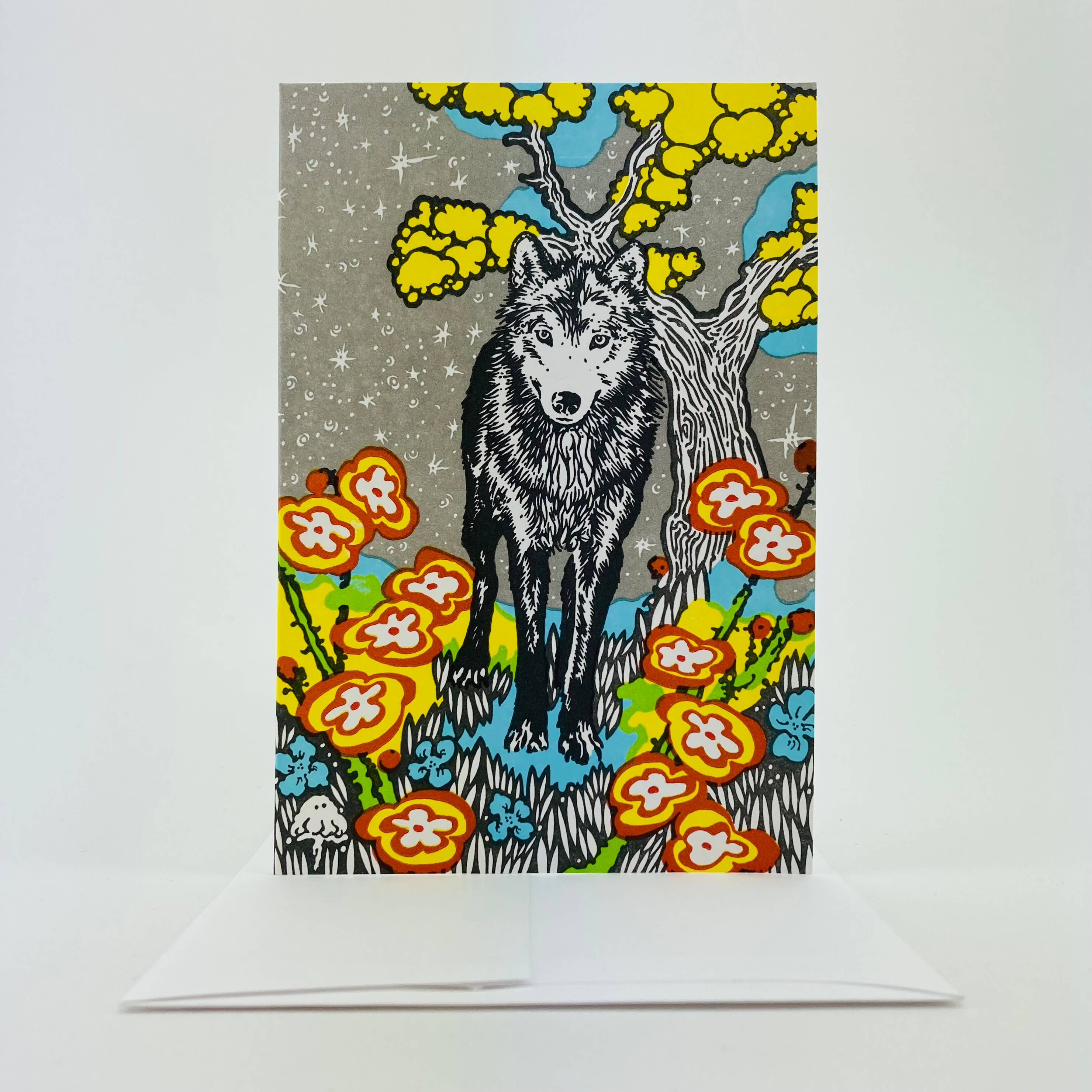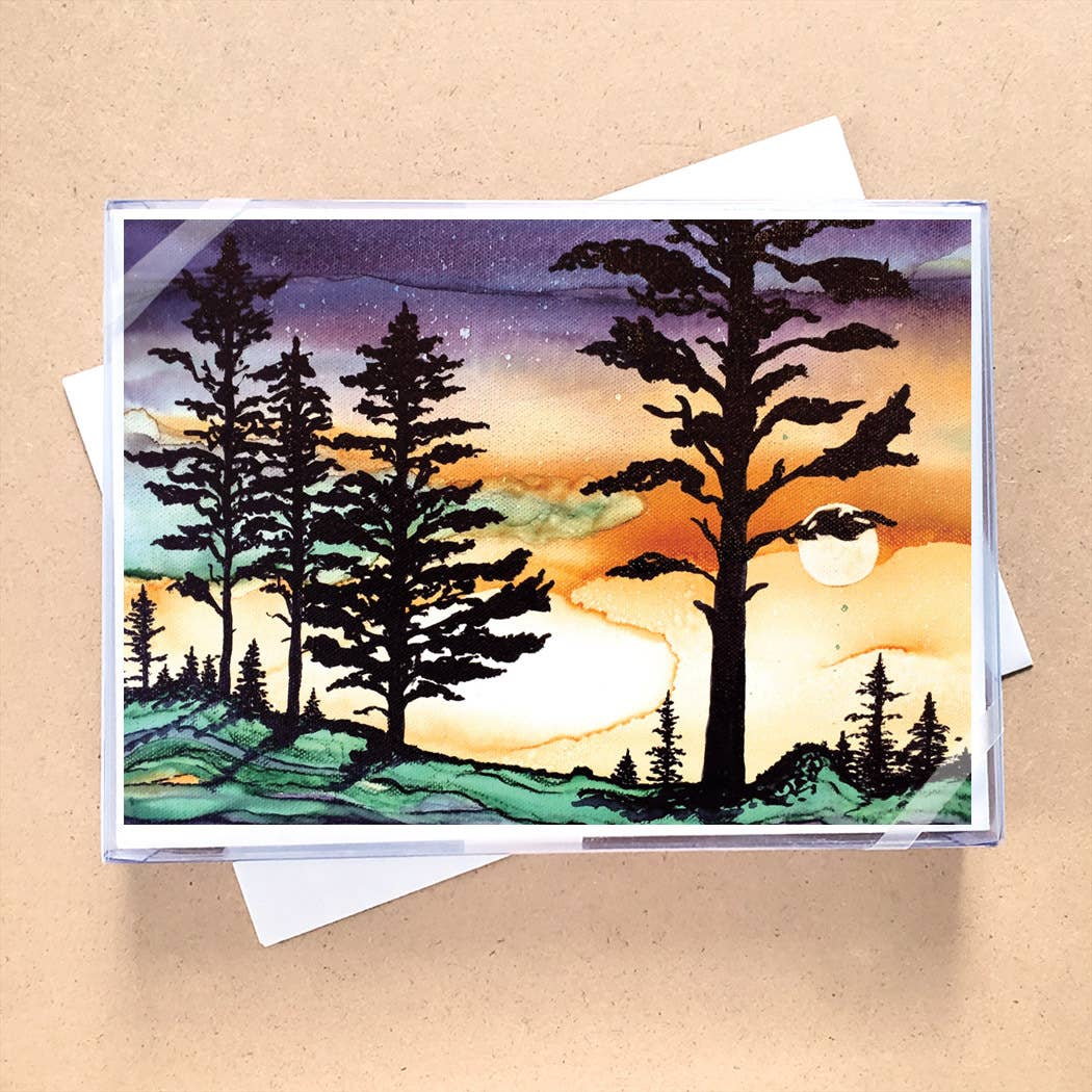 Lapin et acolyte. Camaraderie autour d'un feu de camp. Le lapin et le sasquatch font griller la parfaite guimauve dans les bois profonds. Coffret de 6 cartes et enveloppes dans une boîte en carton aggloméré personnalisée. Letterpressed en plusieurs couleurs superposées. L'intérieur est vide pour votre propre message. Comprend six cartes de 6 1/4 po x 4 1/4 po avec six enveloppes à rabat carré standard A6 assorties.