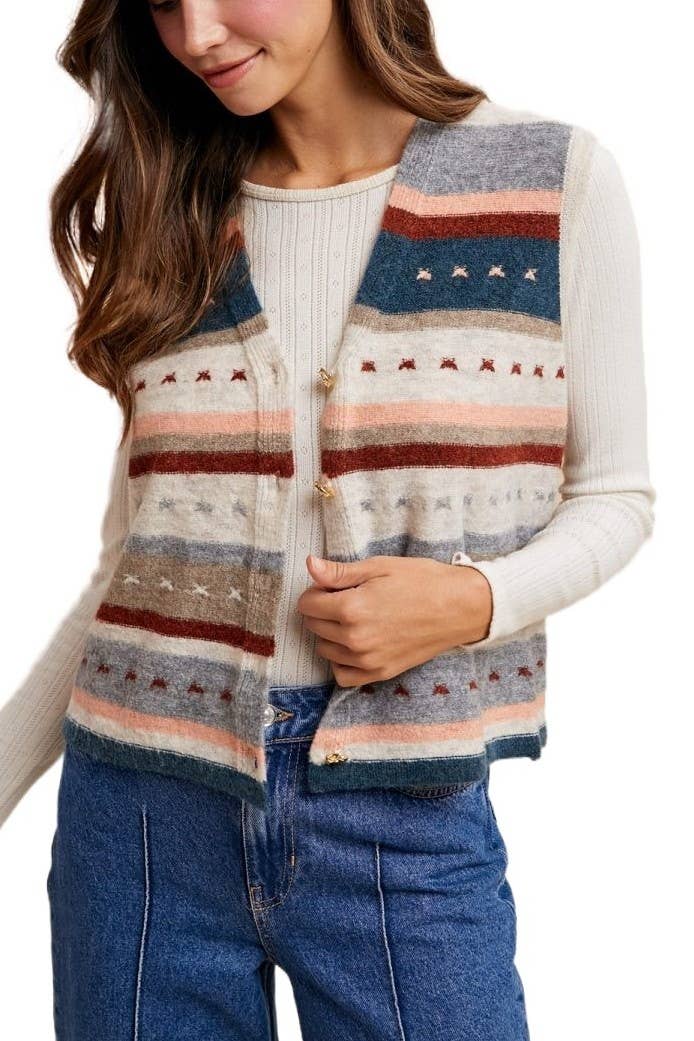 - Gilet en tricot boutonné à motif aztèque - Col rond - Ourlet côtelé - Multicolore (Le mannequin mesure 5 pieds 9 pouces, porte une taille S, rapport de taille 2-2-2)