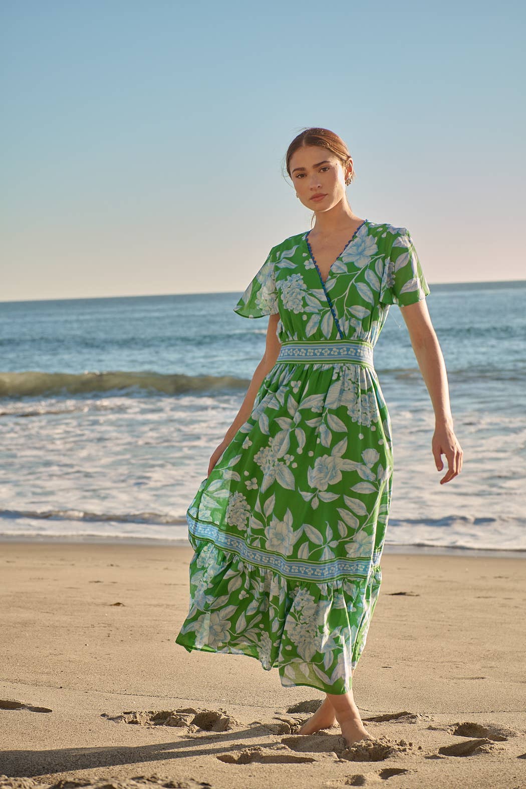 ENCOLURE EN V MANCHES COURTES CEINTURE À NOUER À LA TAILLE AVEC ANNEAU BOUTON AU DOS LE MODÈLE PORTE UNE TAILLE PETITE