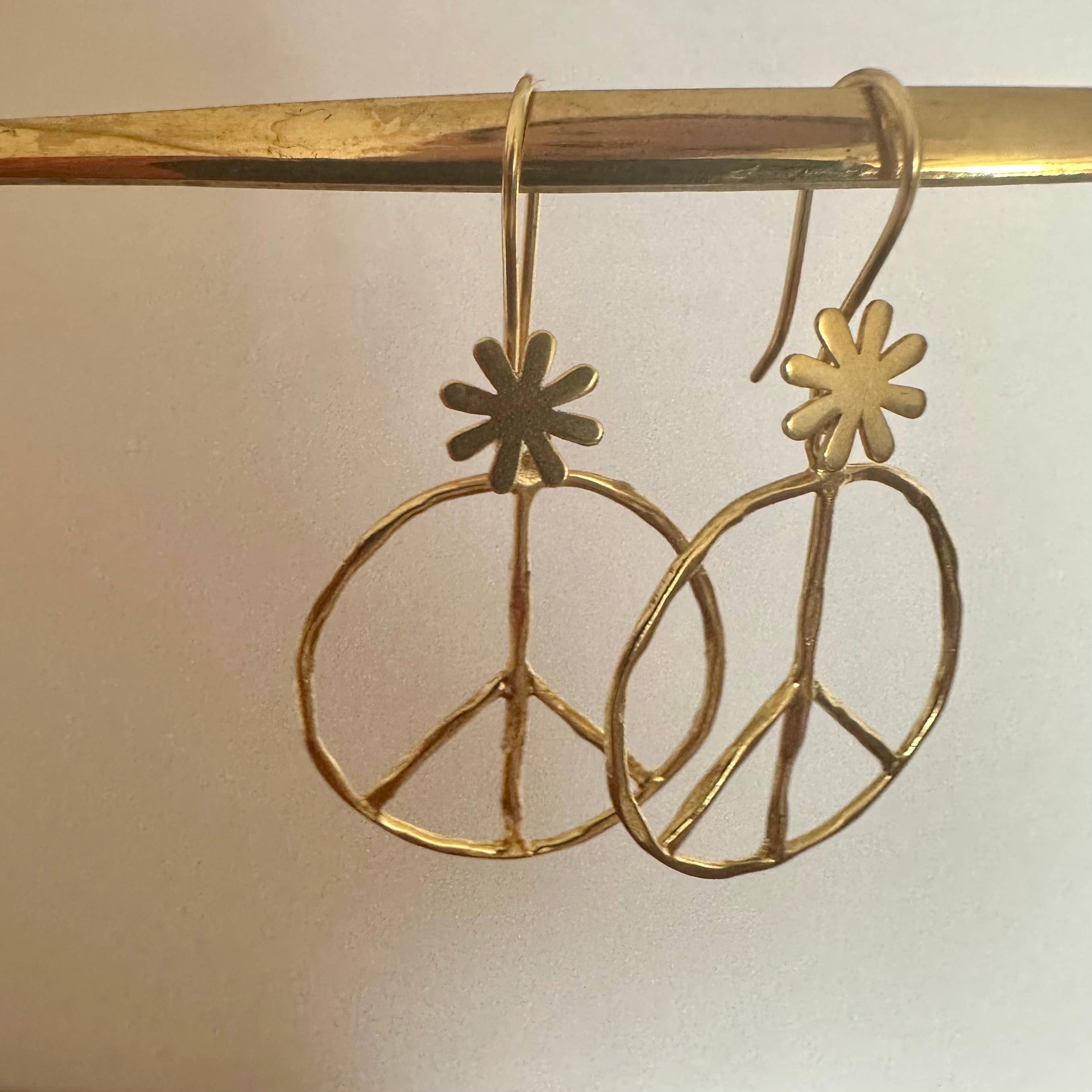 Débordant de style hippie vintage, cette boucle d'oreille signe de paix en argent et or a beaucoup de charme. La texture martelée lui donne une touche vintage vieillie qui ajoute à tout look bohème naturel. Faites la paix avec ces adorables boucles d'oreilles signe de paix martelées en argent et or ! • Fabriqué à la main en Inde • Fil d'oreille à crochet argenté • Texture martelée naturelle • Mesures (environ) 2 po x 1 1/8 po • Matériaux : métal plaqué