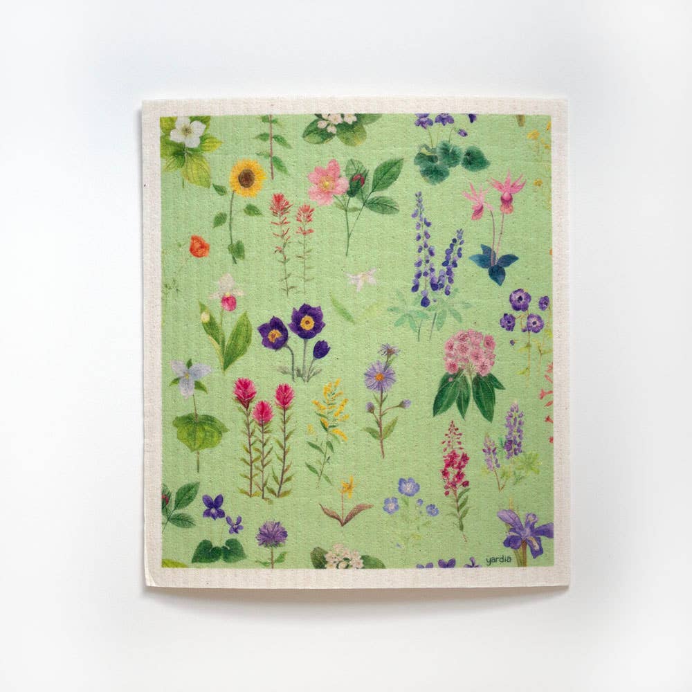 Chiffon écologique compostable suédoise qui présente une illustration de plusieurs fleurs sauvages alpines (indian paintbrush, lupin, lys des glaciers, balsamorhize à feuilles d'arroche) dans un motif décoratif inspiré par la céramique que ma grand-mère a collectionnée en Italie. Fabriquées à partir de cellulose biodégradable et d'un mélange de coton entièrement naturel (80 % cellulose / 20 % coton), ces chiffons sont très similaires au matériau original des chiffons suédois. Ils constituent une excellente alternative aux éponges et aux essuie-tout et sont lavables en machine et au lave-vaisselle, ce qui permet de les réutiliser plusieurs fois, réduisant ainsi les déchets. De plus, ils n'autorisent pas la croissance des bactéries (comme le font les éponges, vous n'aurez donc pas cette mauvaise odeur !). Chaque chiffon absorbe 20 fois son poids, remplace 17 rouleaux d'essuie-tout. Utilisez-les pour laver la vaisselle, essuyer les déversements et nettoyer sans traces les miroirs, portes vitrées et plus encore ! 7" x 7,75". Emballé avec une étiquette d'information au dos et une languette en plastique pour suspendre. Imprimé à la main en petites séries avec des encres à base d'eau. Conçu et imprimé dans le Montana.