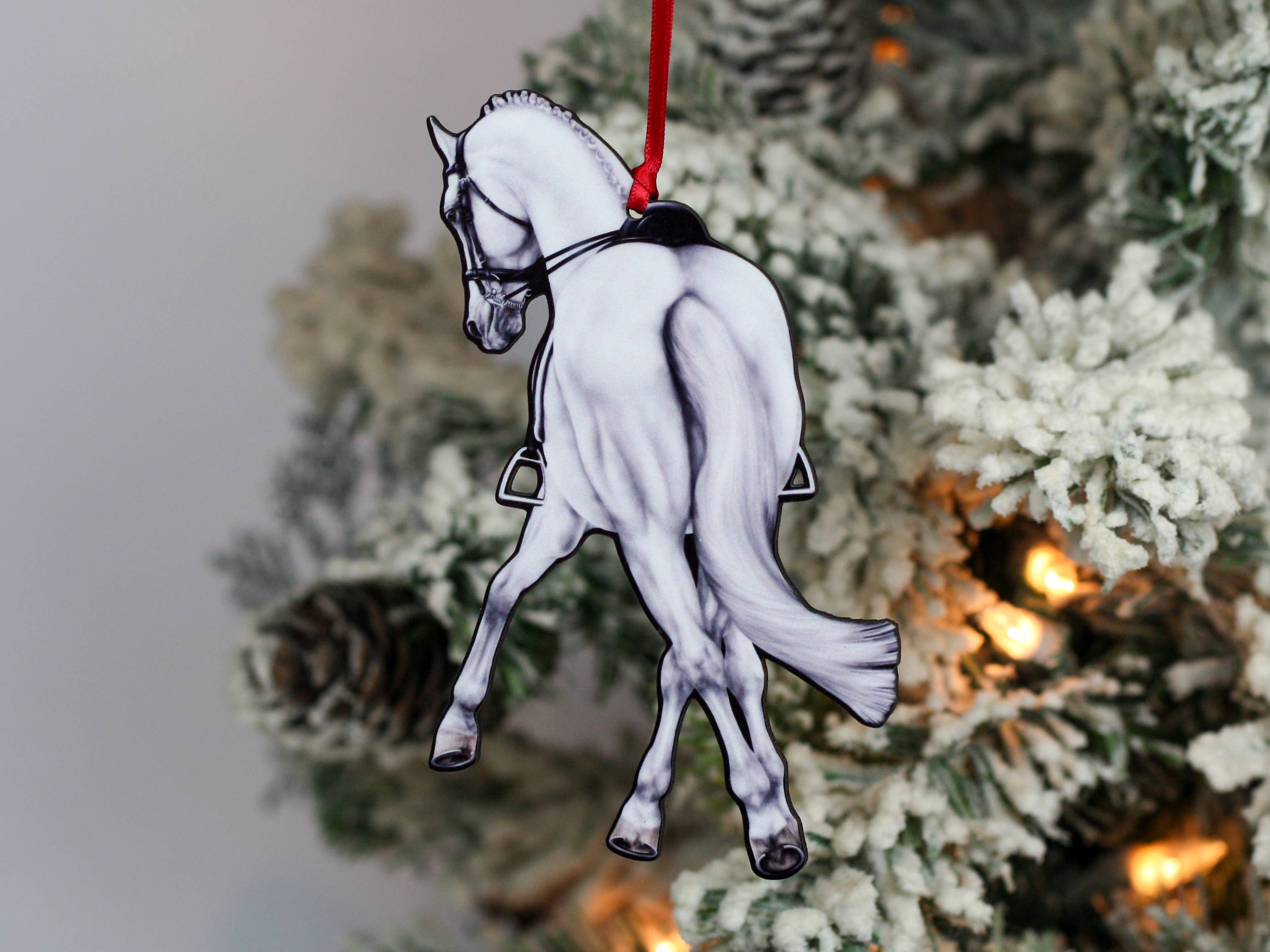 Cet ornement de cheval squelette est fabriqué en bois de bouleau. Il représente une belle image ancienne et est parfait pour l'amoureux d'Halloween dans votre vie. -Bois de bouleau de 1/8" d'épaisseur découpé et gravé au laser -La gravure est rehaussée de peinture -L'arrière du bois est peint en noir -La bélière avec ruban rouge est attachée -Dimensions 3,7 po x 3,9 po