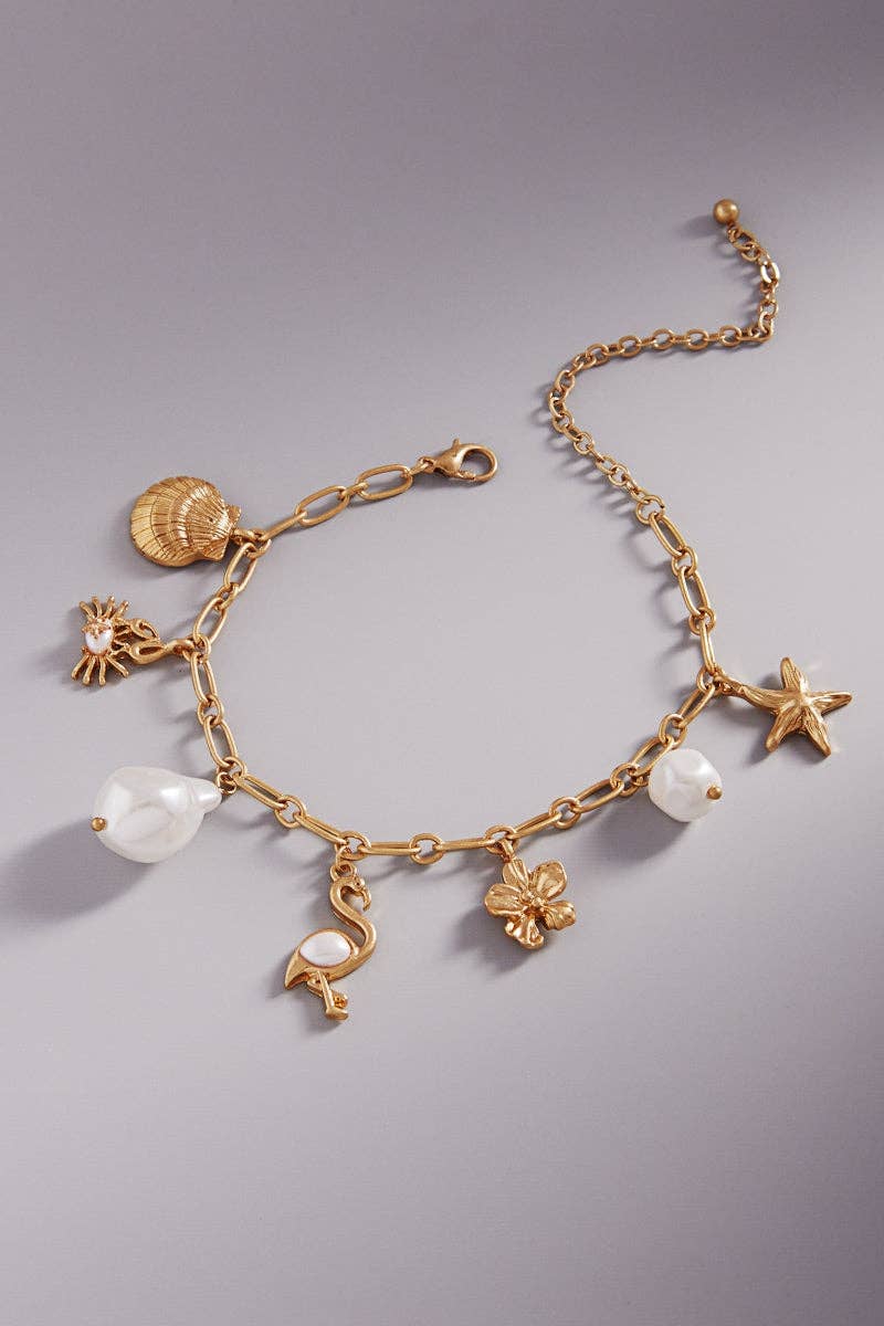 Bracelet à fermoir à bascule doré orné de perles synthétiques et de perles de cristal avec une breloque en forme d'étoile de mer dorée. La breloque mesure environ un pouce. Parfait pour la fête des mères, les vacances d'été et plus encore !