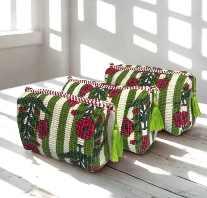 Trousse de toilette multifonction idéale pour ranger et transporter produits de toilette, cosmétiques, soins des ongles et des cheveux. Le coton à imprimé jungle, sérigraphié à la main, est disponible en bleu, blanc, jade et rose. Il est fini par un matelassage avec une doublure intérieure imperméable neutre. Une fermeture éclair dorée avec une languette en tissu facilite l’ouverture, et un crochet pratique permet de suspendre la trousse. Le design est finalisé par des bordures en biais soignées. Un masque pour les yeux, un peignoir et un pyjama assortis sont également disponibles. Dimensions : 27 x 12 x 19 cm 100 % coton La fabrication artisanale de cette gamme la rend véritablement unique. Les légères variations font partie des caractéristiques exclusives et reflètent la créativité des artisans utilisant des techniques traditionnelles. La sérigraphie à la main est une technique très qualifiée qui produit des motifs vibrants au moyen d’un cadre, de pochoirs et de couleurs pigmentées. Il s’agit d’un artisanat intensif issu du patrimoine indien, où les motifs doivent sécher complètement avant d’en appliquer un autre, créant ainsi un tissu distinctif et lumineux. Lavable à la main.