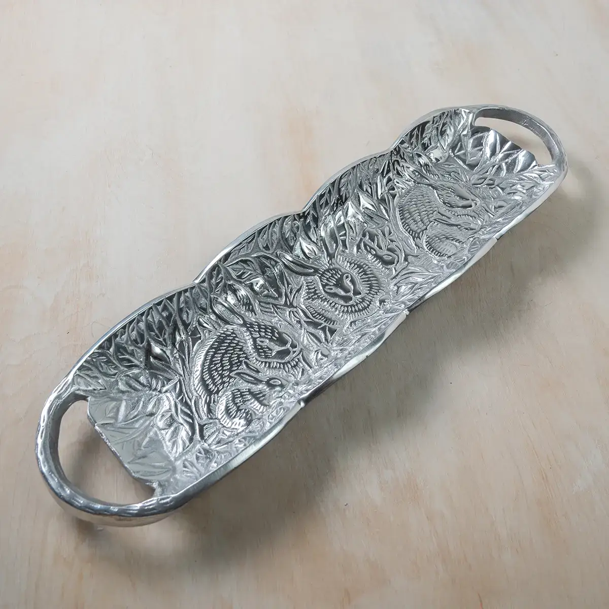 Notre collection Oliveira s'inspire du symbole universel de la paix. L'acier inoxydable est durable, résiste aux rayures et a une beauté propre. La texture martelée de l'acier inoxydable capte la lumière sous tous les angles et permet la création du design délicat. Nous l'appelons un plateau de rangement, mais vous pouvez l'appeler un essentiel pour divertir. Pieds en caoutchouc sur le fond pour éviter les rayures. 10 1/2" dia. pour le plateau rond et 4 1/2" de haut pour la poignée. Lavage à la main recommandé. Fabriqué en Inde.