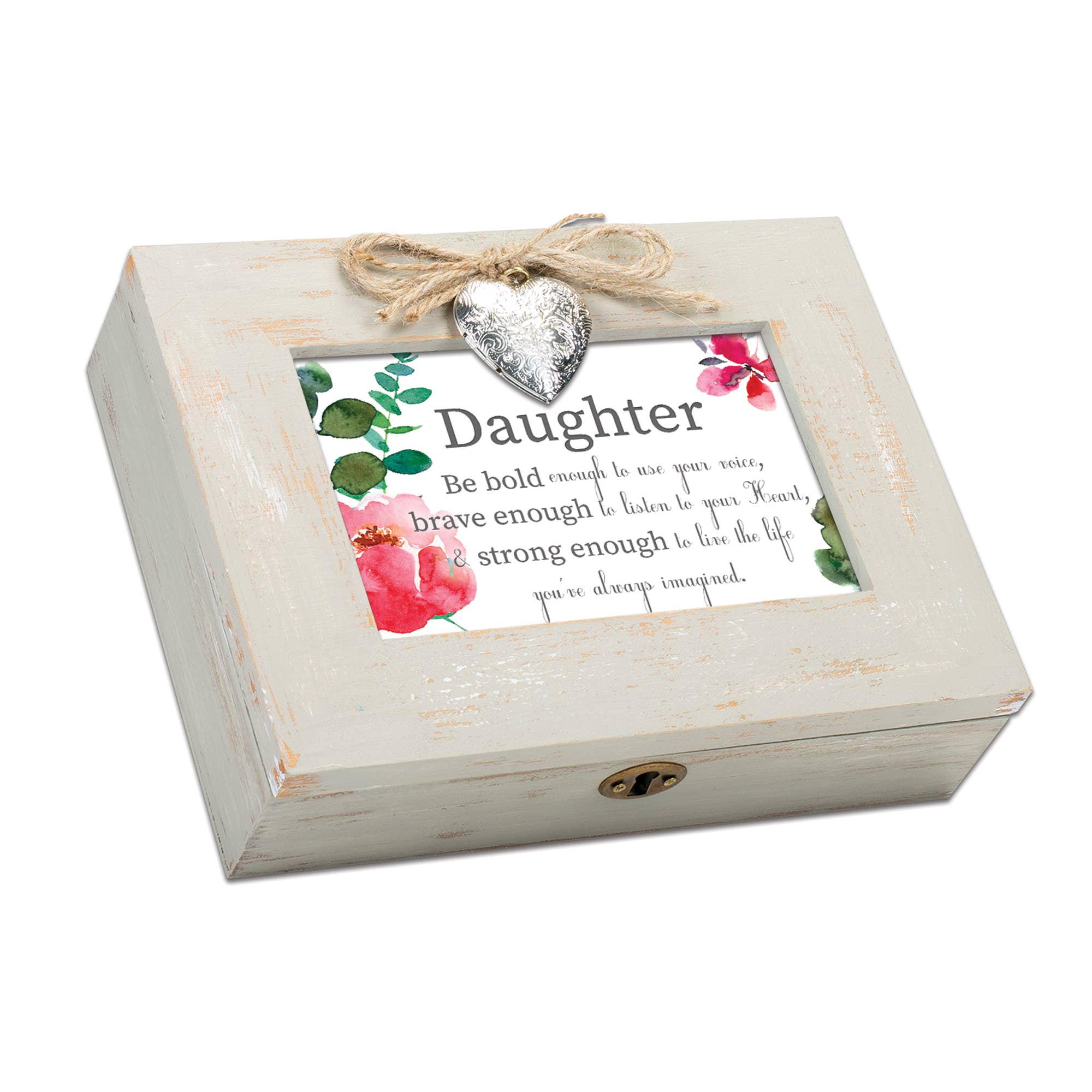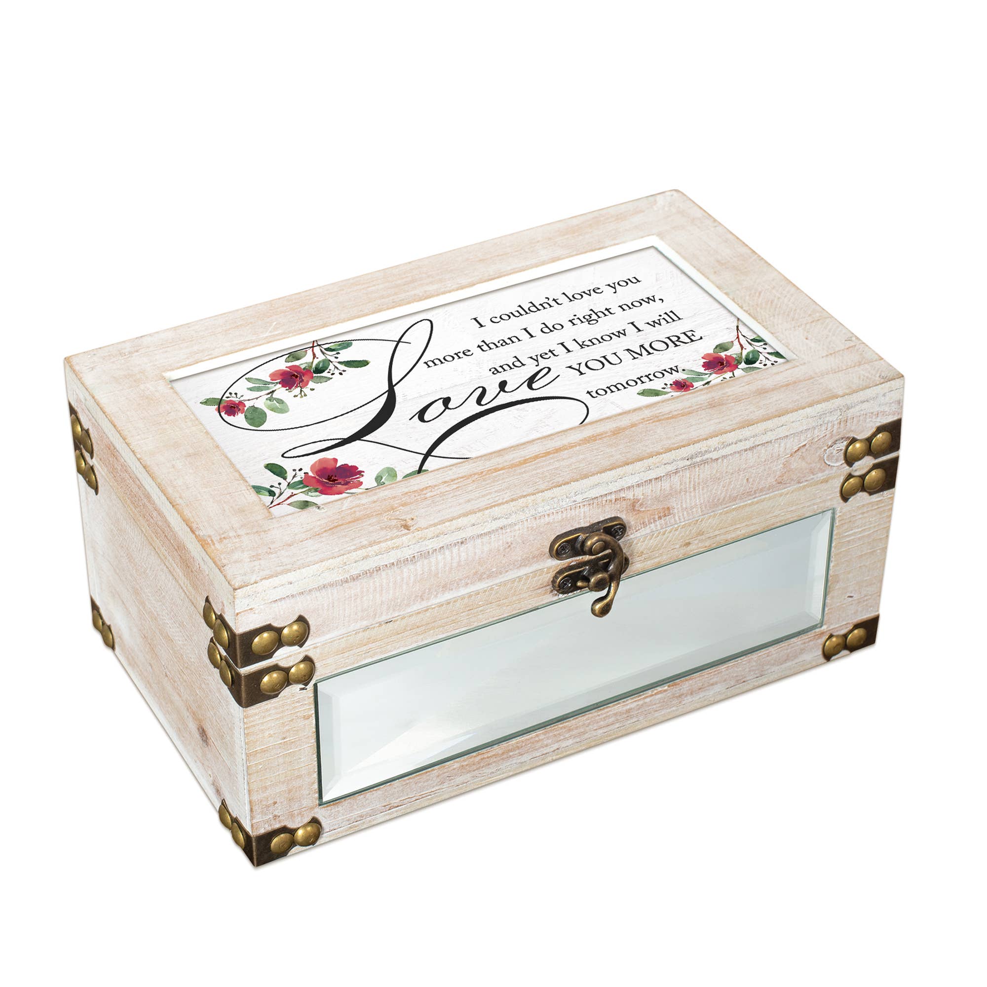 Fabriqué avec un mélange de matériaux en bois massif et de fermetures en métal ; design tendance en bois vieilli avec une finition rustique blanc antique. La boîte à bijoux mesure 9,5 x 5,5 x 4,5" ; panneau avant miroir, ajoute de l'intérêt à vos accents de maison. Remplacez l'illustration par votre propre photo personnelle de 6" x 4". Chanson : Vent sous mes ailes