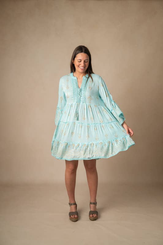 Robe courte verte avec décolleté en V. Ornée de petits cristaux et ajustable sous la poitrine grâce à un lacet orné de pompons élégants. Les manches chauve-souris sont délicatement brodées de perles miroir fines. Ce vêtement est décoré d’un motif flatteur imprimé à la main dans des couleurs vives bleu, vert et or qui mettent en valeur la beauté de la robe. Mesures : 108 cm sous la poitrine et 88 cm de longueur.