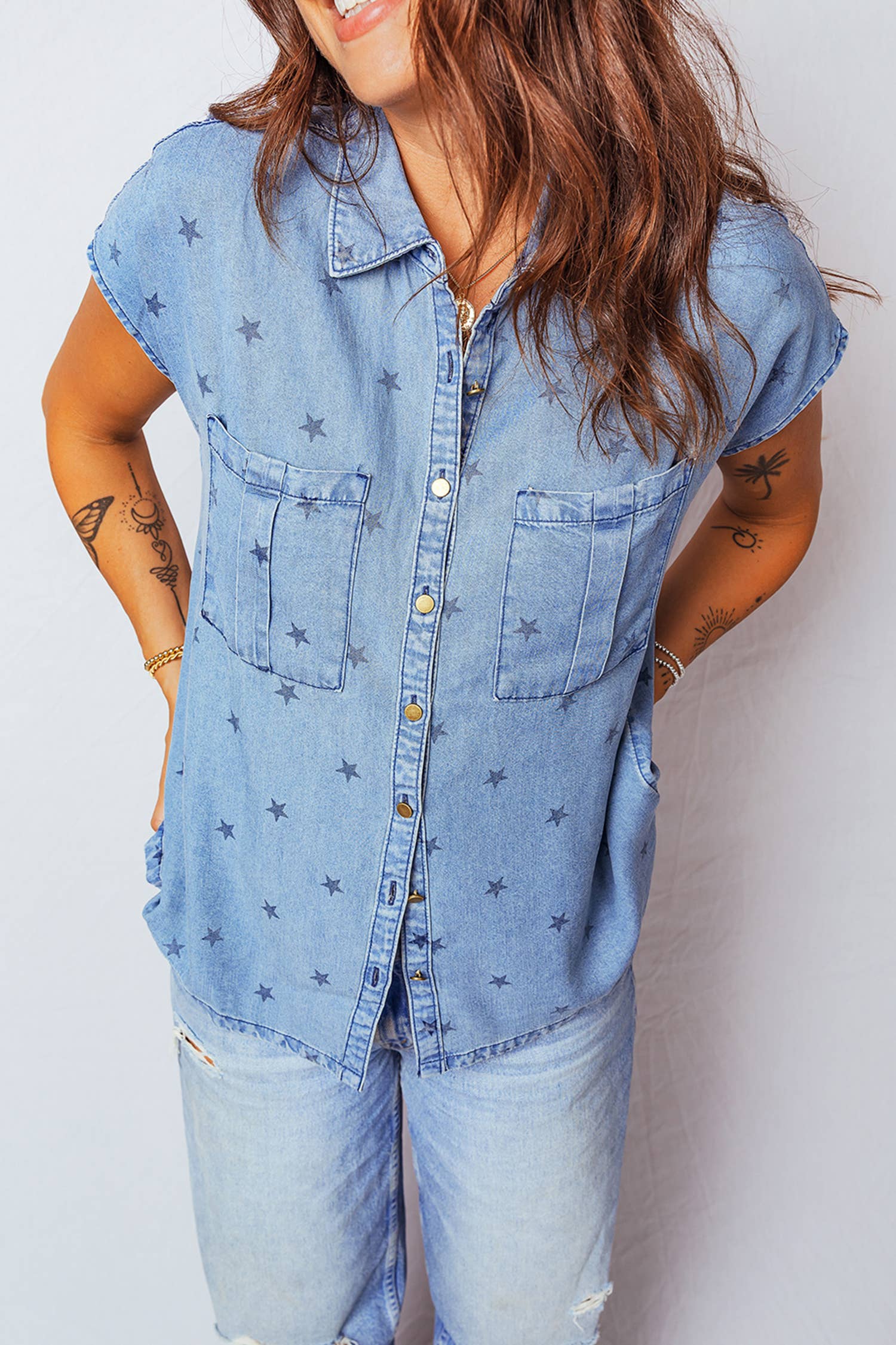 TUNIQUE À MANCHES REGLAN LAVÉES À MANCHES REGLAN À IMPRIMÉ PLUS STAR 100 % COTON Le mannequin porte 1X Hauteur : 5'10" Buste : 42C Tour de taille : 38 pouces HIPS 45 pouces