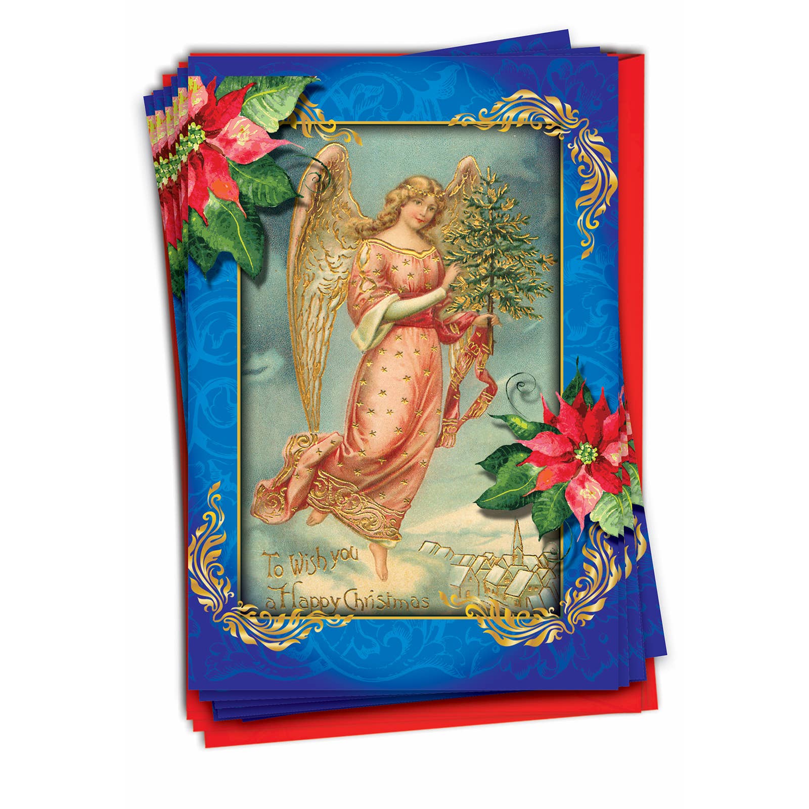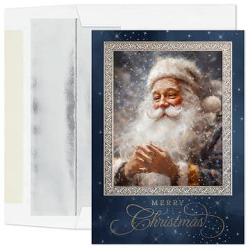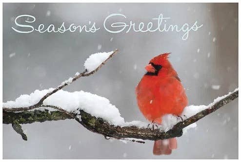 Message intérieur : Joyeuses fêtes. Chaque boîte contient 15 cartes en taille réelle et 16 enveloppes blanches. Image de la carte sur le couvercle de la boîte. 6 5/8 pouces x 4 3/4 pouces. cartes de Noël