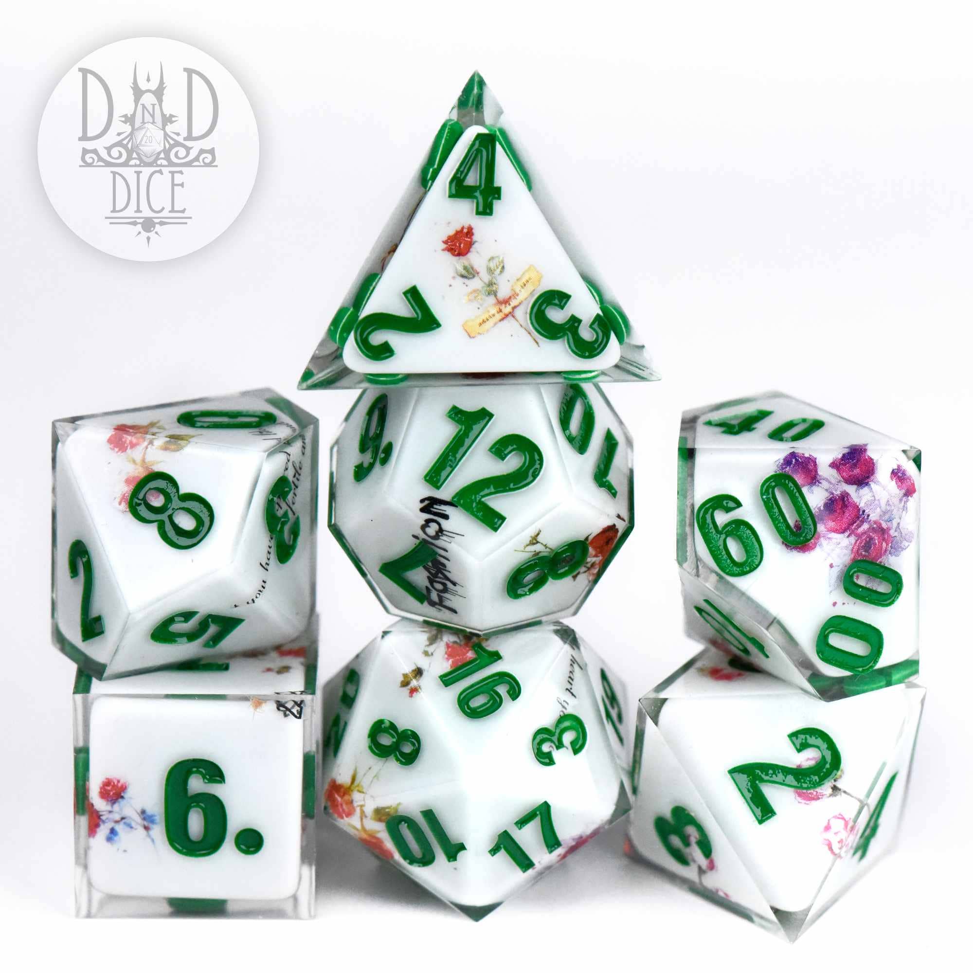 Emballage : Bouteille Ensemble de 7 dés comprend : * 1-D4 (19mm) * 1-D6 (16mm) * 1-D8 (16mm) * 1-D10 (17mm) * 1-D% (17mm) * 1-D12 (18mm) * 1-D20 (21mm) Matériau : Résine