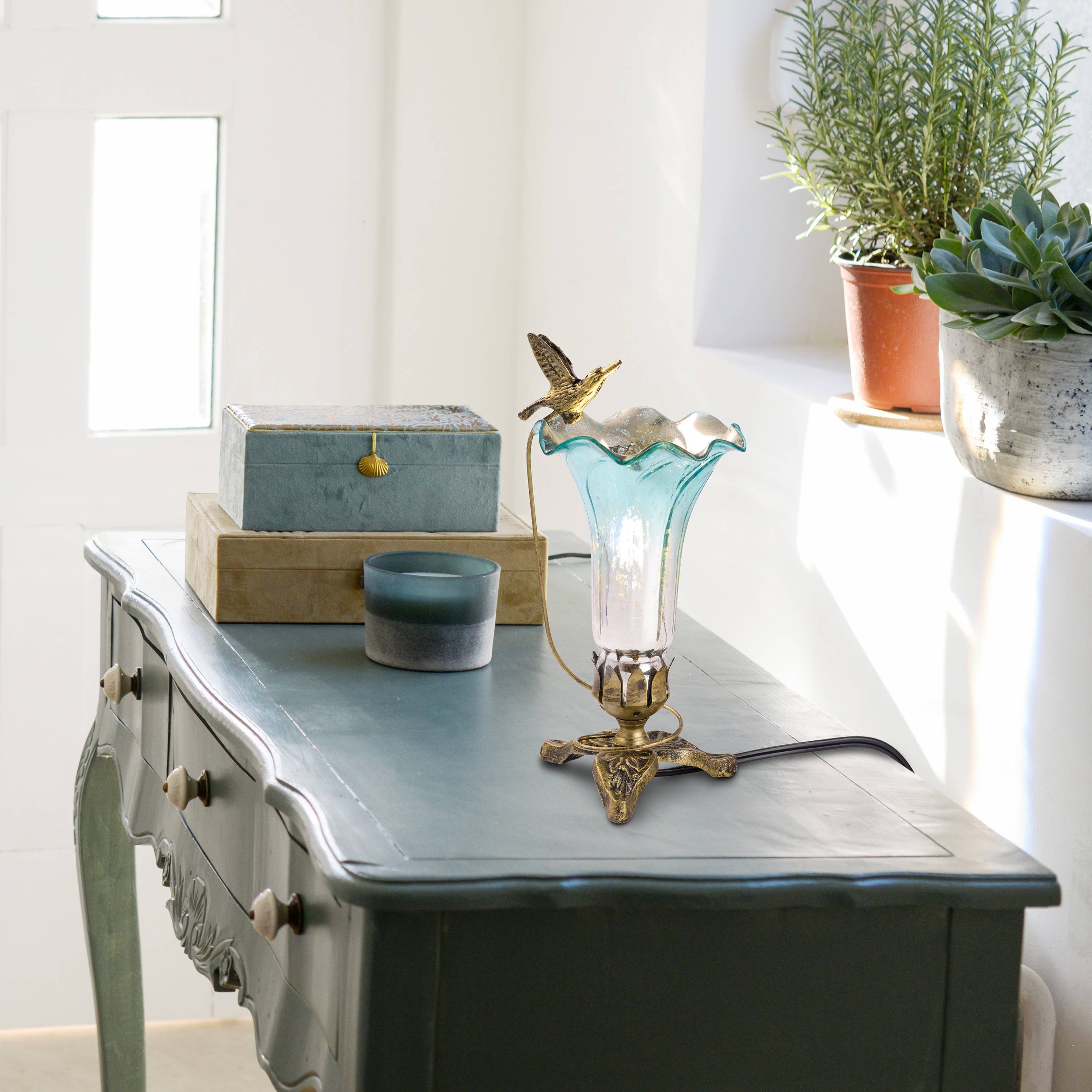 Lampe de lys colibri en verre peint à la main violet/bleu de 9 « h