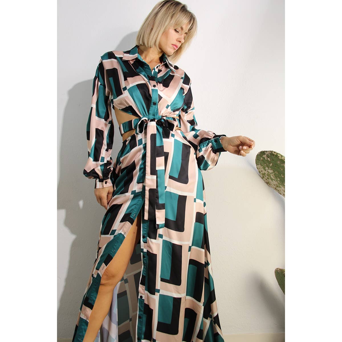 robe longue fendue haute à manches lanterne et imprimé lettre en vente B2B