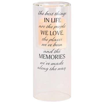 Une douce lueur brille à travers un message de confort sur ce photophore qui fait un cadeau de deuil attentionné. Les carrés en verre sont givrés à l'extérieur et réfléchis à l'intérieur pour améliorer la lumière de la bougie chauffe-plat LED incluse sur l'étagère centrale. La taille de la pièce est de 4 po de largeur x 4 po de hauteur x 2,4 po de profondeur. Message : Toujours dans nos pensées, pour toujours dans nos cœurs.