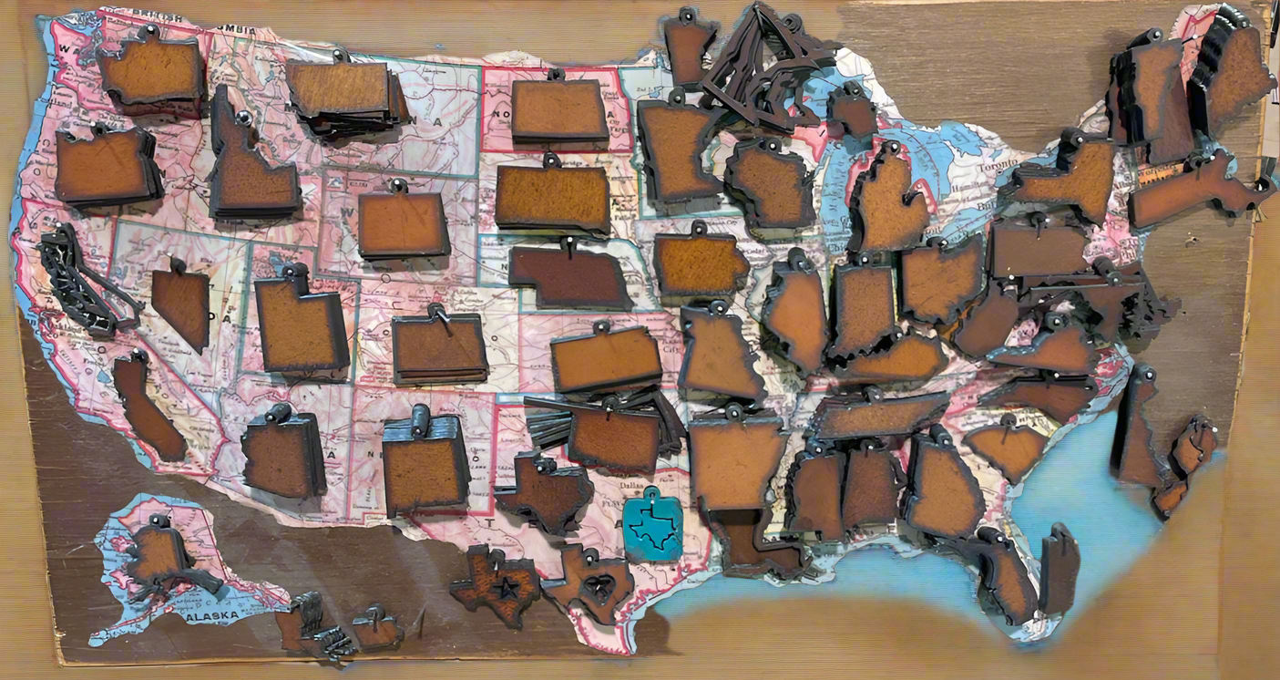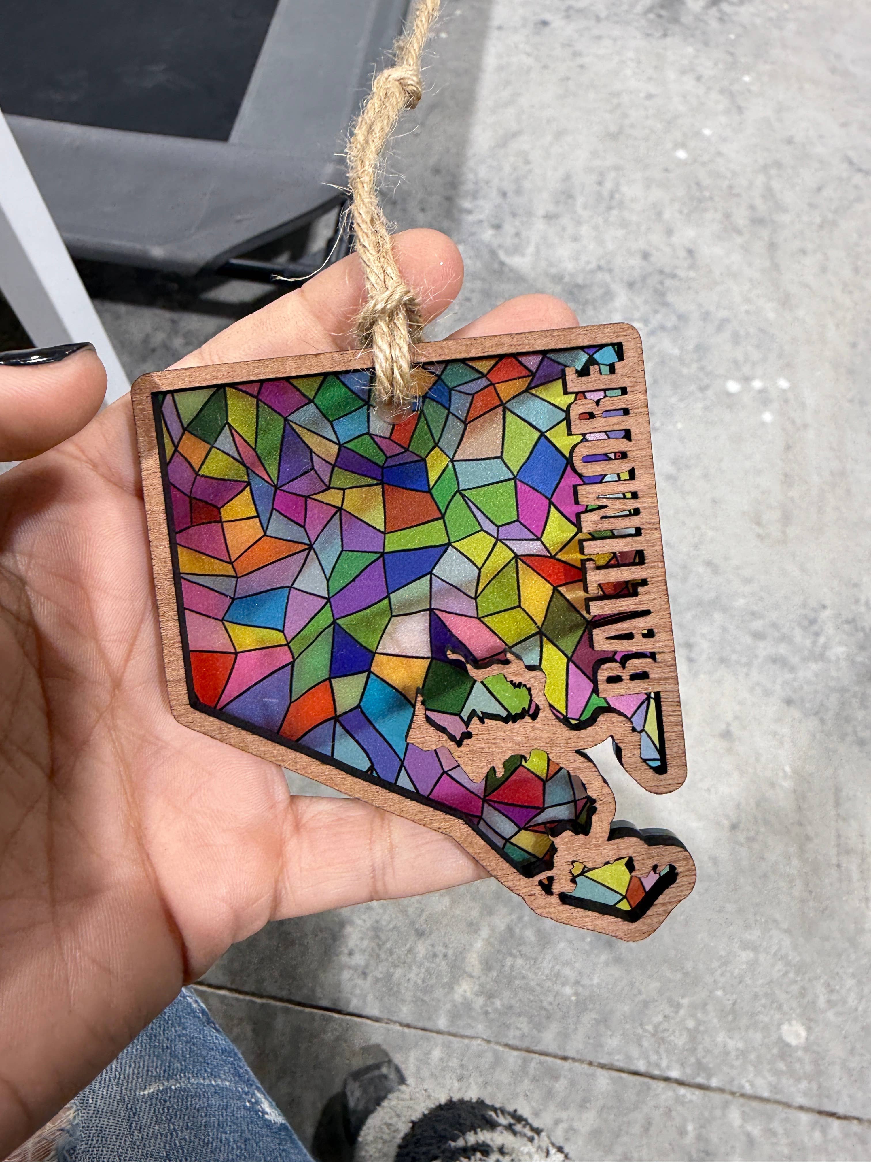 Décorations d'État en vitrail. La largeur et la longueur varient selon l'état (voir ci-dessous), 1/4 de pouce d'épaisseur, double couche et finition avec de la ficelle. Chaque État est vendu séparément. L'emplacement du motif varie. Matériau : acrylique spécial, noyer (veuillez noter qu'ils ne sont pas fabriqués avec du verre, il s'agit d'un acrylique imprimé aspect « vitrail » qui n'est pas fragile !) Les ornements sont emballés sur une carte dans un sac en plastique transparent avec une étiquette volante. Fabriqué à la main à Kansas City, MO Dimensions : Alabama 3,9 x 2,5 pouces, Alaska 3,6 x 4,3 pouces, Arizona 3,7 x 3,1 pouces, Arkansas 3,2 x 3,8 pouces, Californie 4 x 3,6 pouces, Colorado 2,8 x 3,8 pouces, Connecticut 2,8 x 3,8 pouces, Delaware 3,9 x 1,9 pouces, Floride 3,6 x 3,9 pouces, Géorgie 3,8 x 3,3 pouces, Hawaï 1,5 x 5 pouces, Idaho 3,8 x 2,7 pouces, Indiana 3,8 x 2,6 pouces, Illinois 3,8 x 2,1 pouces, Iowa 2,4 x 3,9 pouces, Kansas 2,1 x 3,8 pouces, Kentucky 2 x 4,4 pouces, Louisiane 3,7 x 3,8 pouces, Maine 3,9 x 2,9 pouces, Maryland 2,3 x 4,5 pouces, Massachusetts 2,5 x 4,6 pouces, Michigan 3,9 x 3,9 pouces, Minnesota 3,7 x 3,7 pouces, Mississippi 3,8 x 2,4 pouces, Missouri 3,2 x 3,9 pouces, Montana 2,2 x 3,9 pouces, Montana 2,2 x 3,9 pouces, Mississippi 3,8 x 2,4 pouces, Missouri 3,2 x 3,9 pouces, Montana 2,2 x 3,9 pouces,