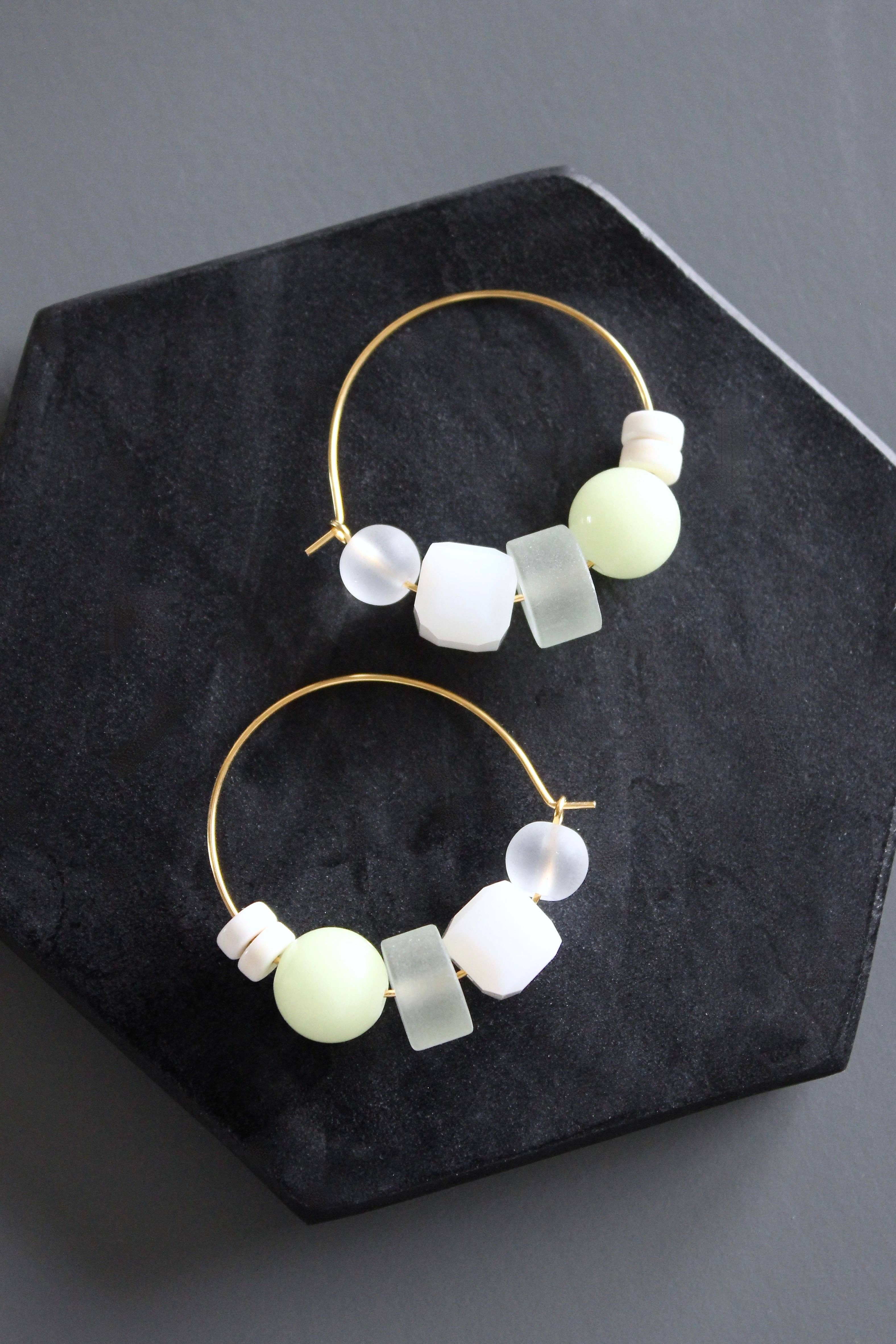 Rubans de film irisé transparent entrelacés de perles de nacre. Ces créoles captent la lumière sous tous les angles et reflètent toutes les couleurs, du rose au bleu en passant par l'or. Il s'agit de la taille mini de nos créoles originales Iridescent Pearl. Elles mesurent 1 5/8" de long.