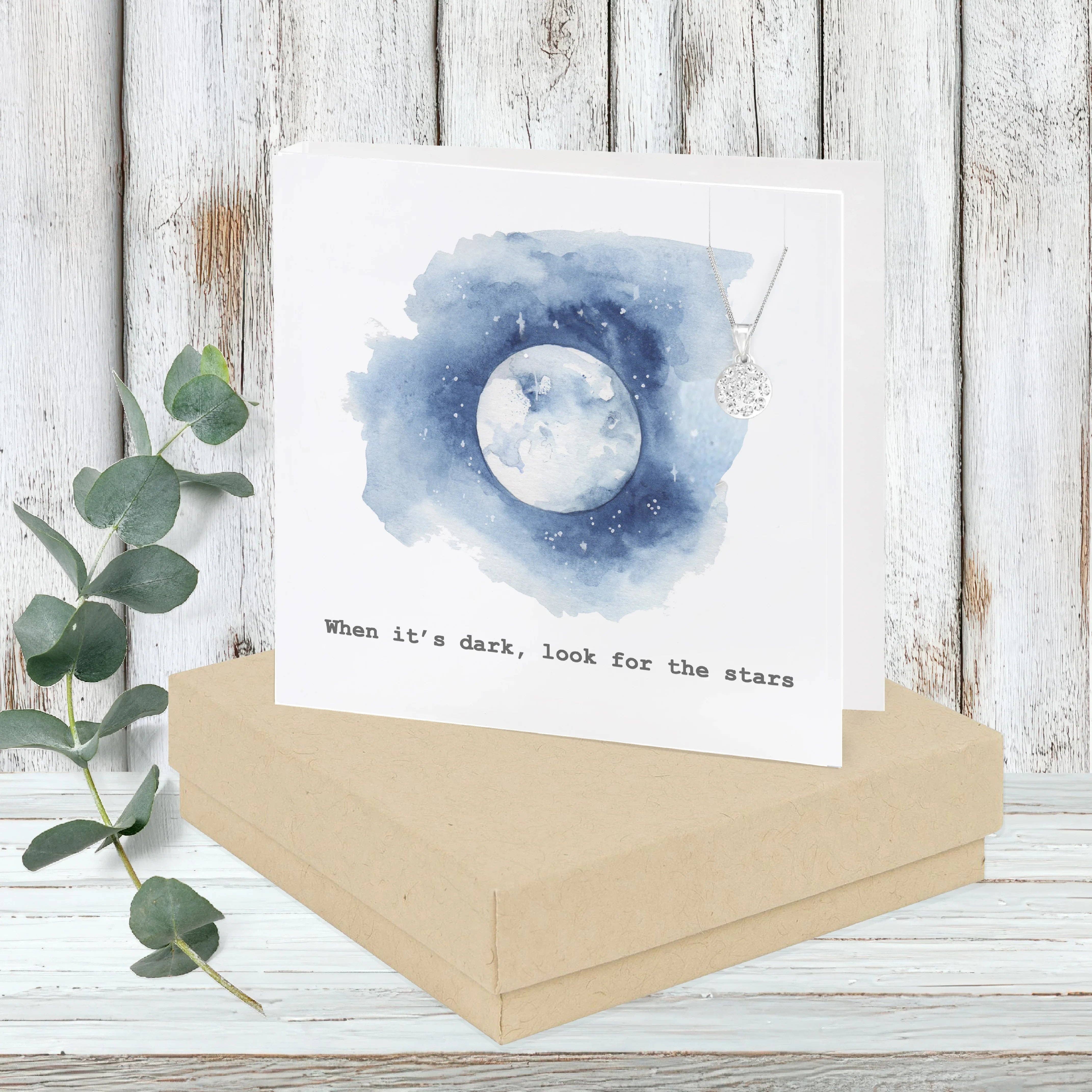 Carte de vœux blanche mesurant 85 mm x 85 mm Papier certifié FSC de 350 g/m² fabriqué ici au Royaume-Uni Finition à la main avec bijou en argent sterling Chaîne à maillons de 18" avec pendentif en cristal Intérieur vierge pour votre propre message Boîte cadeau blanche ou kraft brun mesurant 90 mm x 90 mm x 23 mm Conçu et fabriqué en Grande-Bretagne Carte et cadeau en un Cadeau boîte aux lettres Livraison gratuite au Royaume-Uni continental et en Irlande du Nord