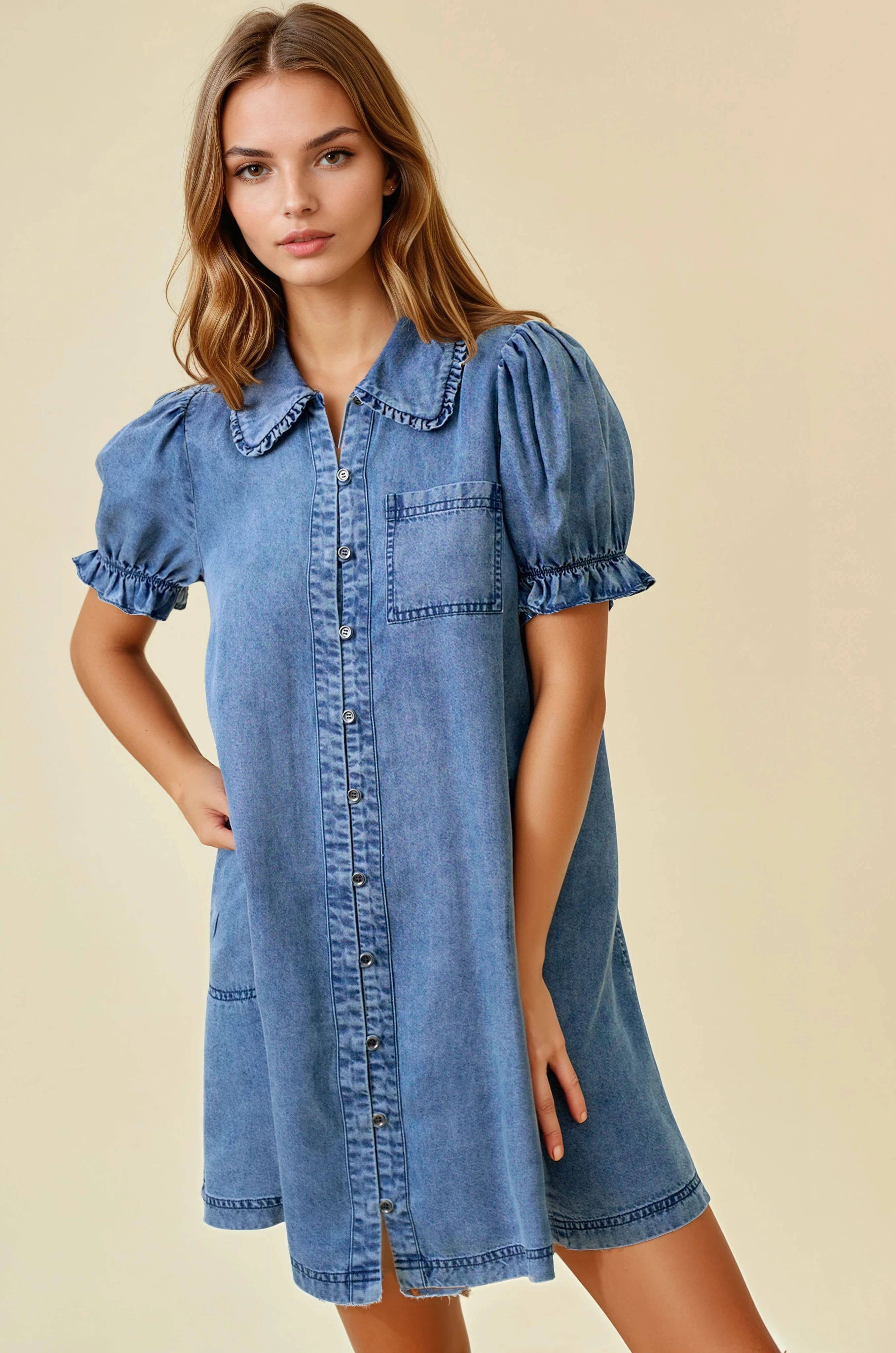 CD05238-Robe en jean à détails festonnés avec boutons