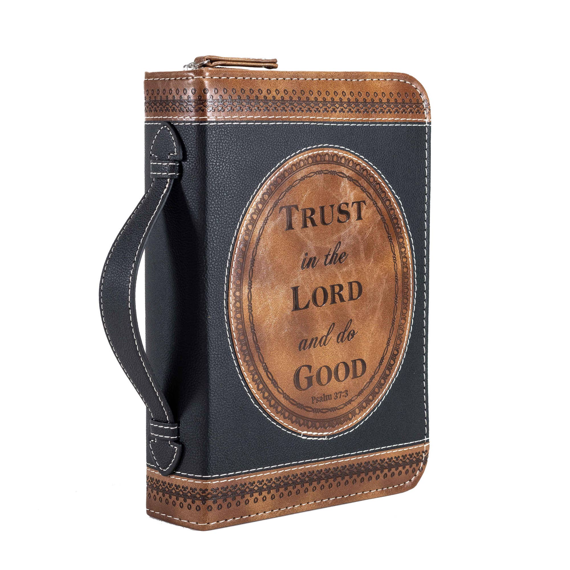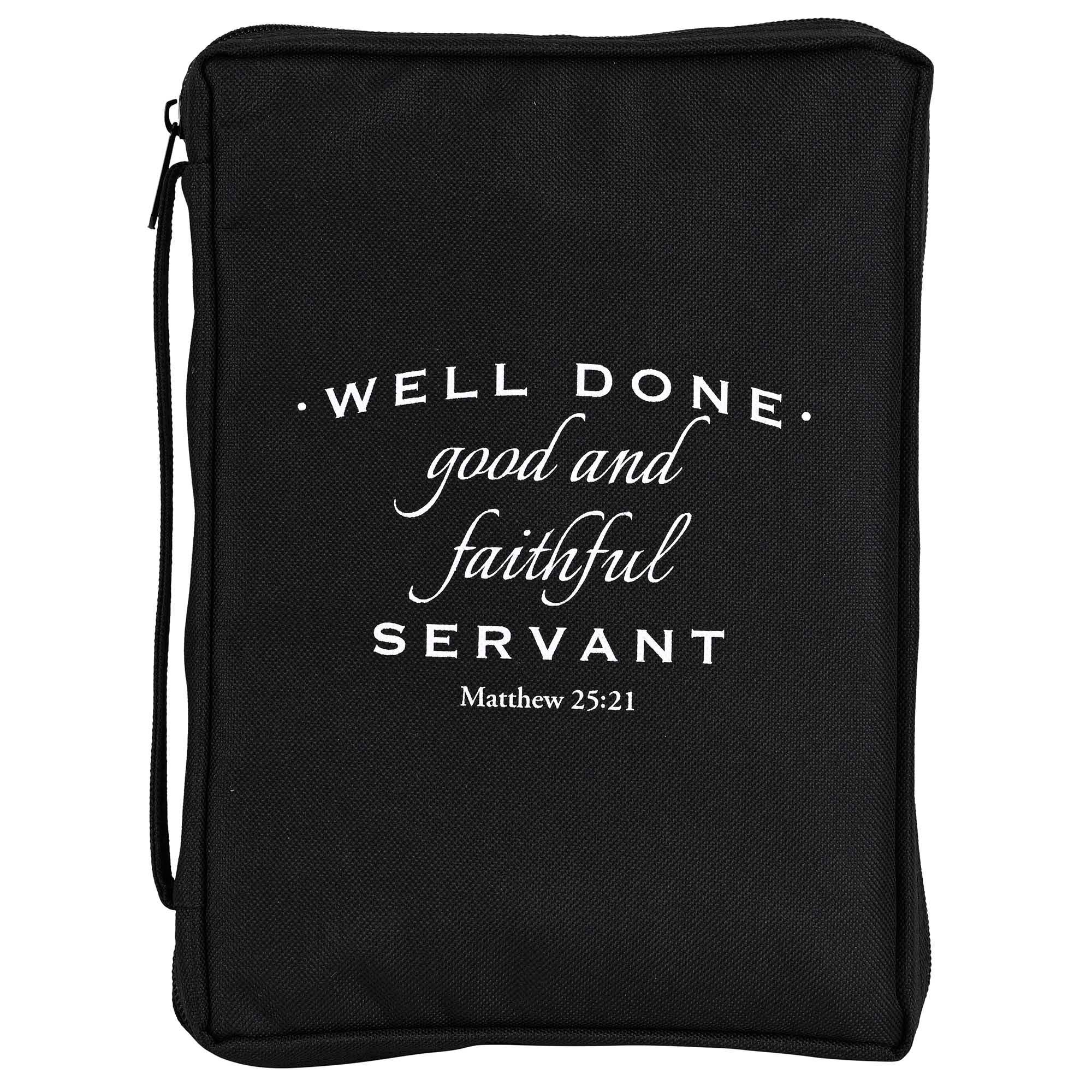 Cette couverture de Bible en tissu noir est fabriquée en polyester robuste aspect toile de 600 deniers avec coutures renforcées en nylon. Fermeture éclair latérale antirouille et autoréparable. Poignée de transport sur le côté. La couverture repose complètement à plat lorsqu'elle est ouverte ; à l'intérieur se trouve une boucle pour votre stylo et un marque-page en ruban attaché. Le grand format peut contenir une Bible ou un livre jusqu'à environ 7-1/8 x 2 x 10-1/4. L'homme de Dieu avec Jérémie 17:7 : Béni soit l'homme qui a confiance dans le Seigneur et dont le Seigneur a l'espoir.