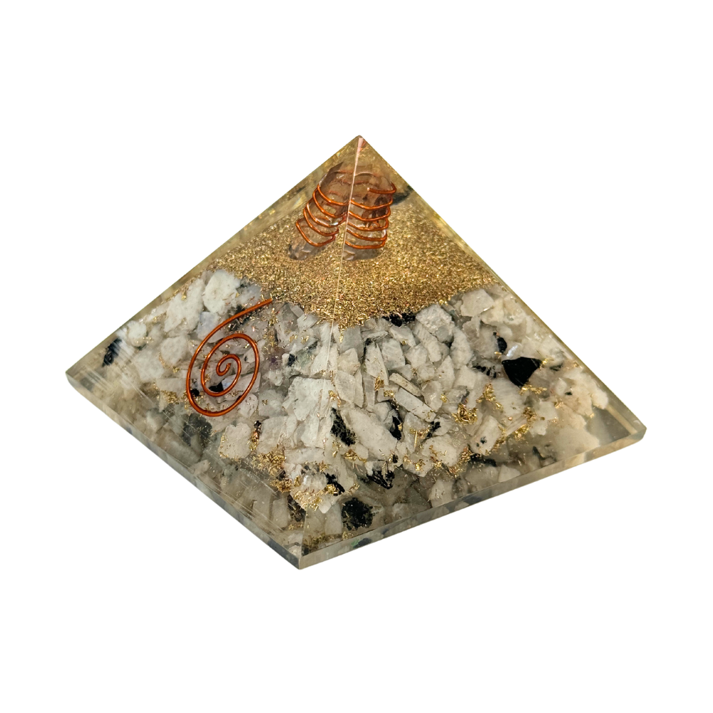 Cette mini pyramide orgonite Fleur de Vie Stargate est faite à la main. Elle contient du lapis-lazuli, du quartz clair, de l'apatite bleue, de la labradorite, des rubis, de la lépidolite et des flocons d'or pur comestible 24 carats, ainsi que quatre bobines supraconductrices intégrées dans cette pyramide d'orgone.