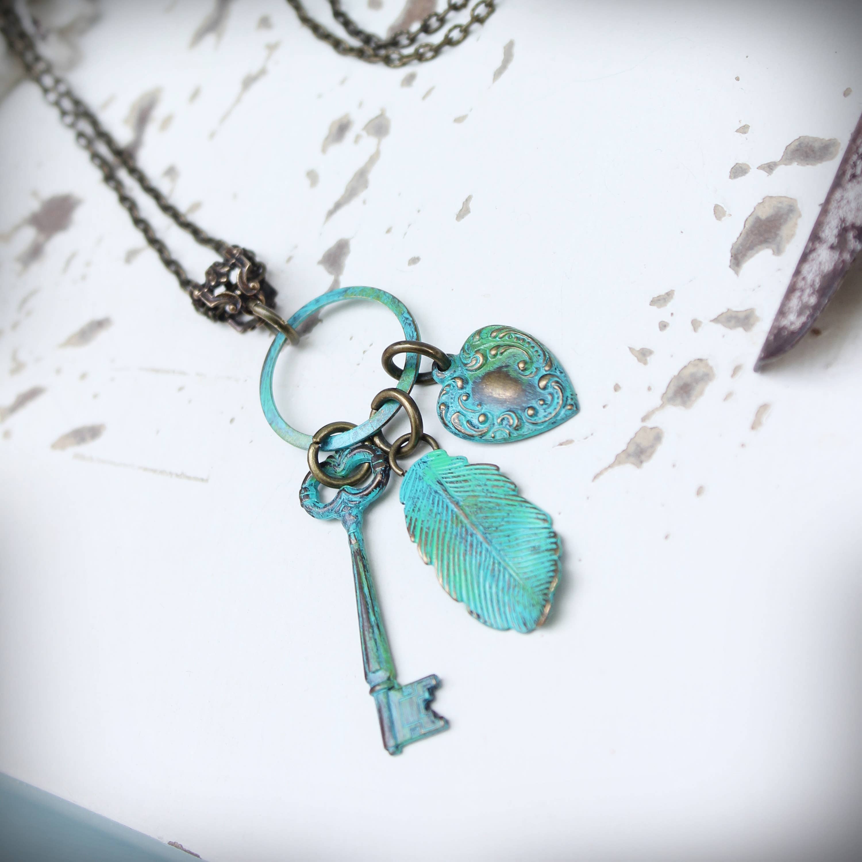 Collier clé en laiton avec breloque turquoise et gland. Ce collier est doté d'une jolie clé en laiton vieilli en forme de pendentif joint par une jolie breloque de gland et un fil de laiton enroulé en forme de goutte turquoise. La chaîne est en laiton et n'a pas de fermoir, elle glisse simplement au-dessus de votre tête. Le collier mesure 26 pouces La clé mesure environ 45 mm de long La forme de la clé en laiton peut varier légèrement par rapport à la clé montrée, mais sa taille sera similaire.