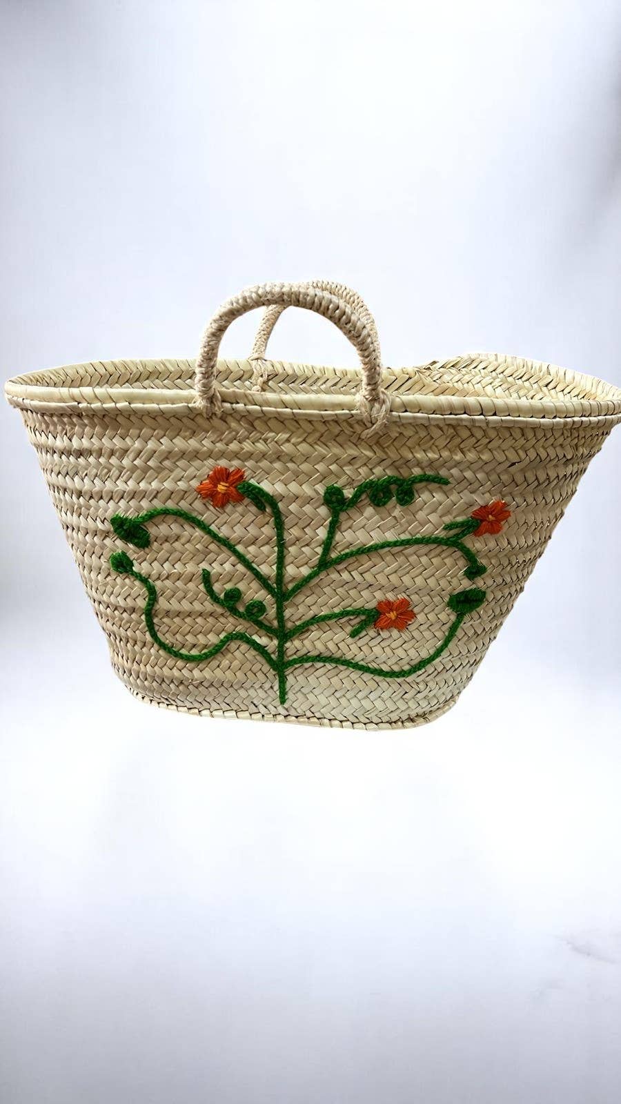 Ajoutez une touche ludique à vos activités quotidiennes avec ce charmant panier en paille tissé à la main, orné d'une broderie représentant une branche de tomates. Idéal pour faire vos courses, aller au marché ou comme option de rangement décoratif, ce panier écologique allie savoir-faire traditionnel et style moderne. Confectionné avec soin par des artisans marocains, il est à la fois robuste et spacieux. Ses dimensions d’environ 43 x 37 x 24 cm offrent amplement d’espace pour vos essentiels quotidiens. Cette pièce artisanale unique est un ajout durable à votre collection.