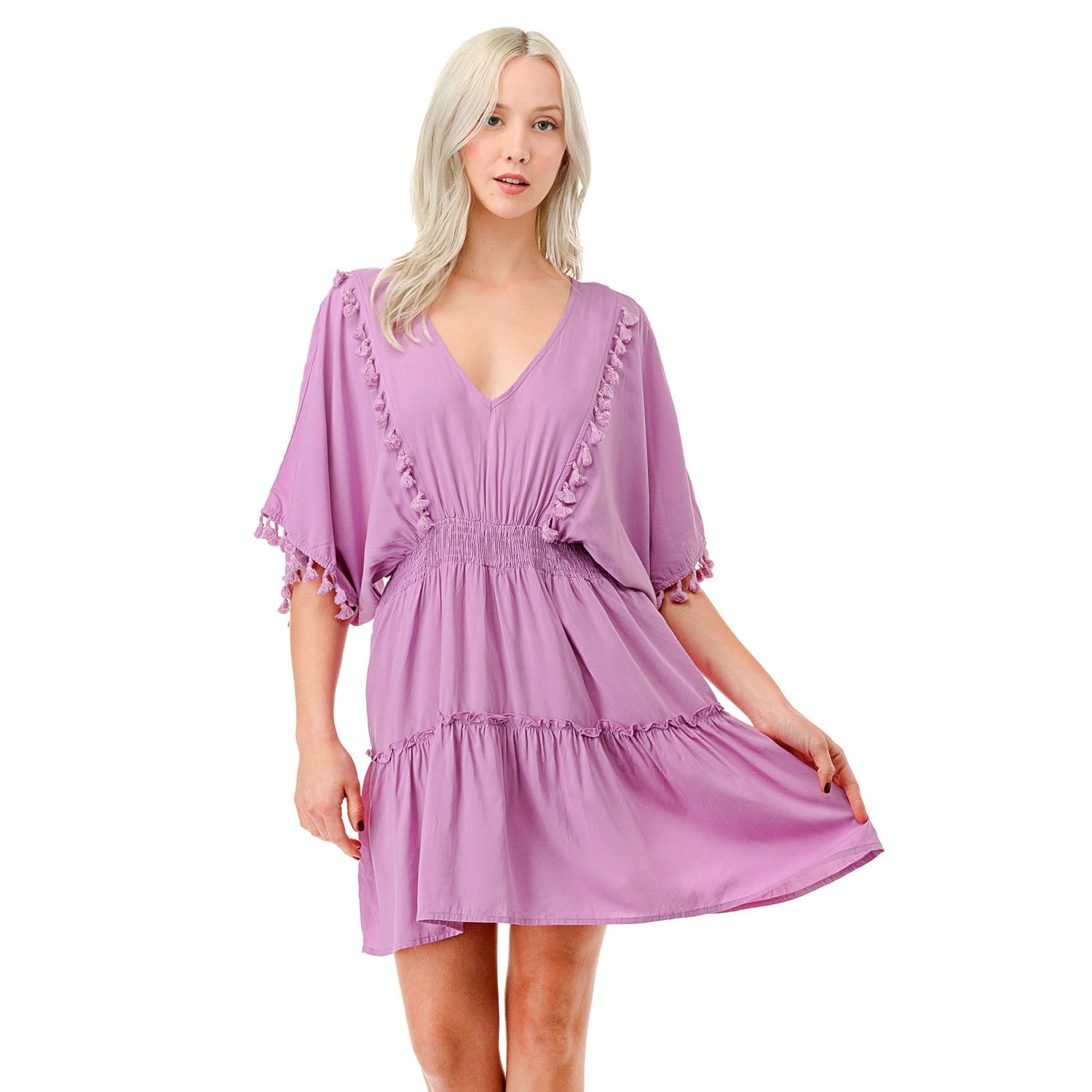 Robe courte en soie unie à volants LS, les manches peuvent se boutonner à une longueur 3/4, les manches sont en rayonne, la robe est au-dessus du genou Taille unique Fabriqué en Italie