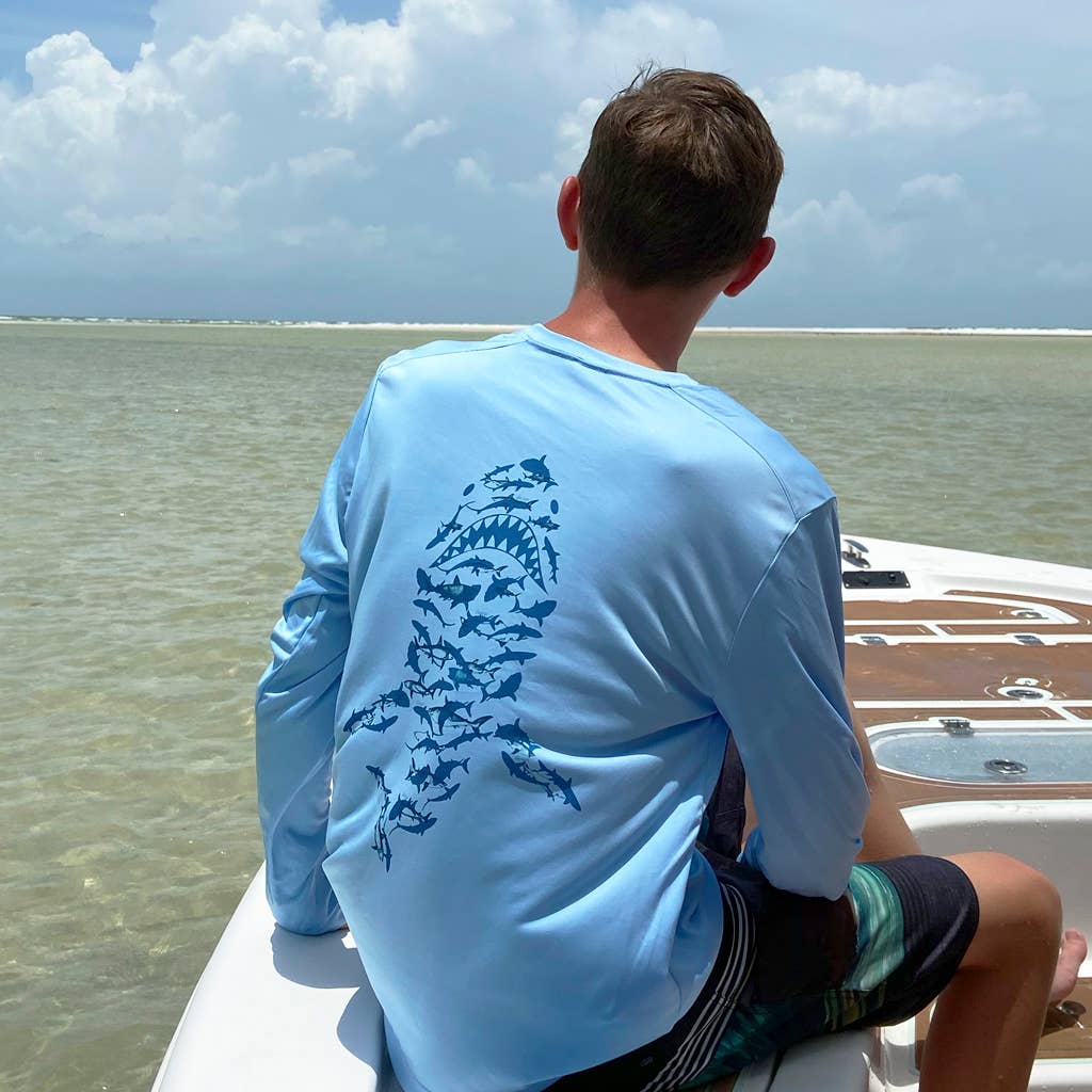 Si vous regardez de plus près, de minuscules poissons dessinent la forme du bateau. Imprimé sur notre chemise Blue Mist Ultra Comfort, ce t-shirt vous gardera au frais et à l'aise tout en vous protégeant du soleil. Col rond à manches longues. Graphisme de bateau centré sur le dos de la chemise. Motif de bateau avec logo sur le devant gauche de la poitrine. 100 % polyester microfibre. UPF 50. Technologie d'évacuation de l'humidité et séchage rapide pour votre confort. Lavable en machine. Séchage au sèche-linge. Tissu importé. Imprimé aux États-Unis.