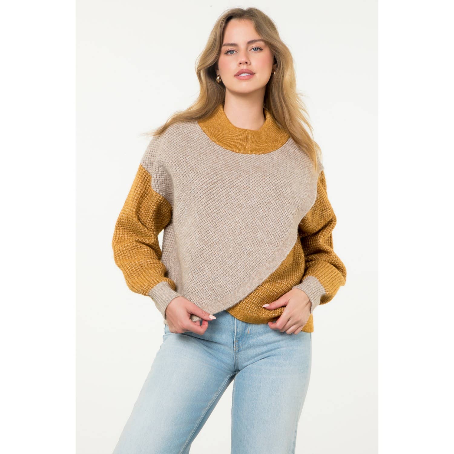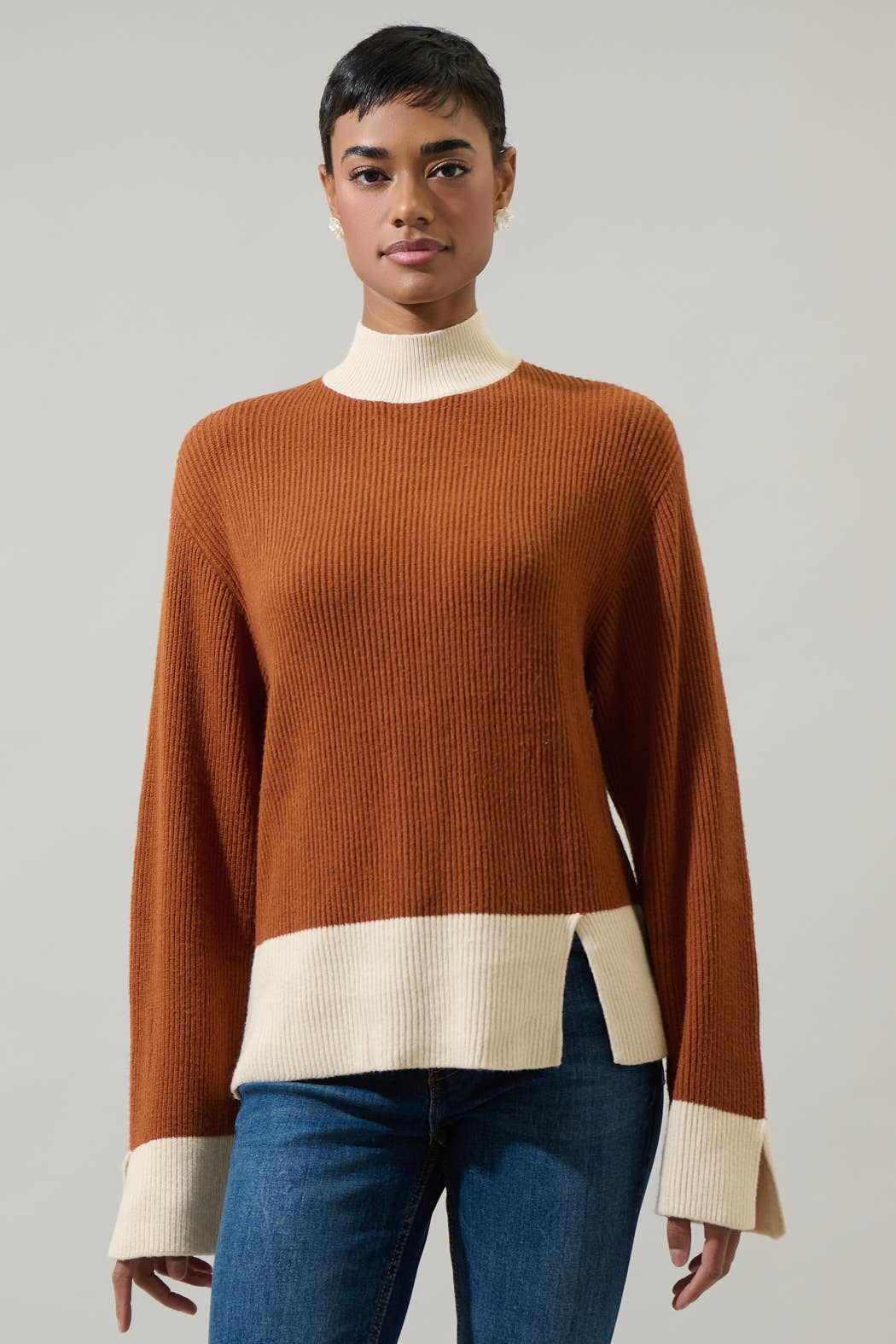 Un pull en tricot côtelé uni présentant les caractéristiques suivantes : Pull à col roulé. Manches longues avec coutures apparentes contrastantes. Épaules baissées. Coupe décontractée. Informations sur le modèle : Hauteur : 5 pieds 9 pouces | Buste : 32 pouces | Tour de taille : 24,5 pouces | Hanches : 34 pouces | Taille S