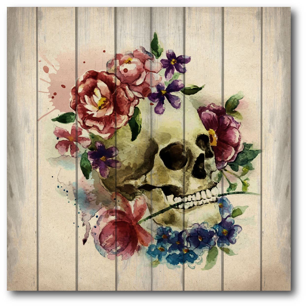 Gravure de crâne avec fleurs aquarelles dans des tons roses en vente B2B