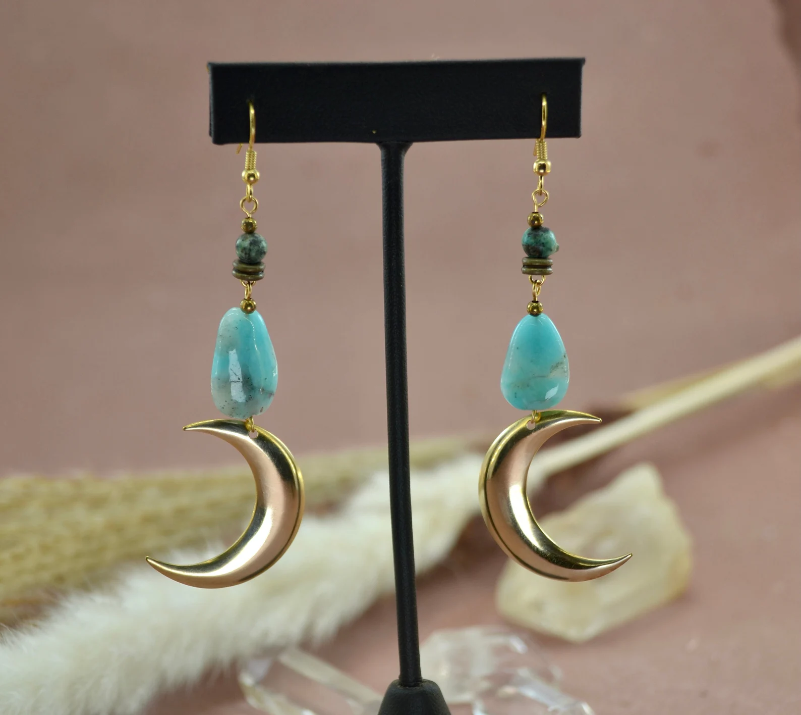 Dimensions : 7,8 x 2,8 cm. Poids : 18 g. Boucles d'oreilles Soulmates en cristal naturel vintage 🥰 Vous recevrez de nombreux compliments en les portant 💖 Les anciens Égyptiens croyaient que la lune portait chance et les rendait invulnérables. Il permet au chakra de la gorge de communiquer et d'exprimer sa créativité, de se sentir à l'aise pour exprimer ses sentiments, d'inspiration artistique. Matériau : pierre naturelle, alliage.