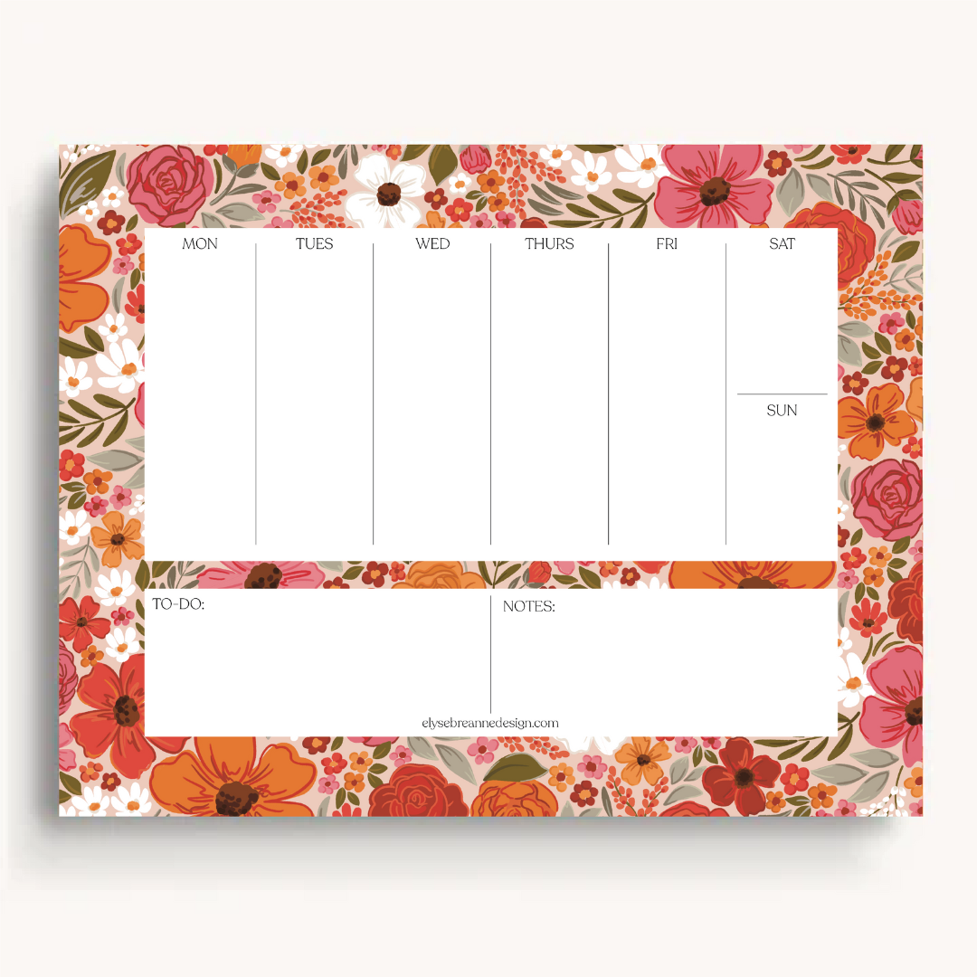Nos blocs-notes hebdomadaires sont le complément parfait à votre bureau ! 8,5 pouces x 11 pouces 50 draps détachables Coque arrière blanche épaisse avec logo Emballage en polyéthylène transparent avec autocollant en forme de smiley Liste de coordination et petit bloc-notes disponibles séparément